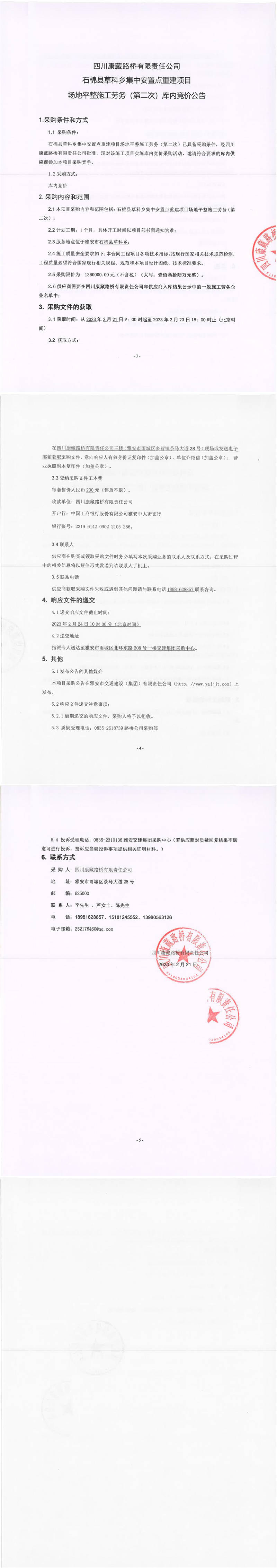 四川康藏路橋有限責(zé)任公司石棉草科鄉(xiāng)集中安置點(diǎn)重建項(xiàng)目場(chǎng)地平整施工勞務(wù)(第二次)庫(kù)內(nèi)競(jìng)價(jià)公告