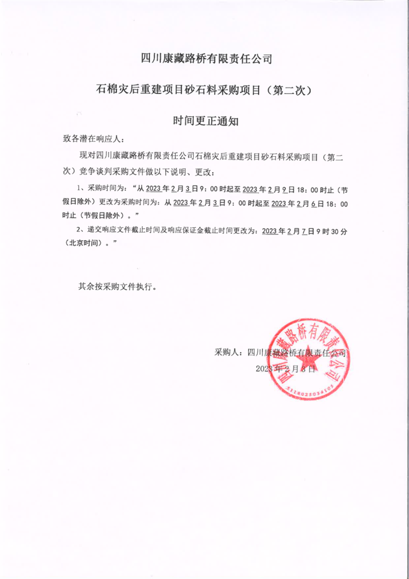 四川康藏路橋有限責(zé)任公司石棉災(zāi)后重建項(xiàng)目砂石料采購項(xiàng)目(第二次)時(shí)間更正通知