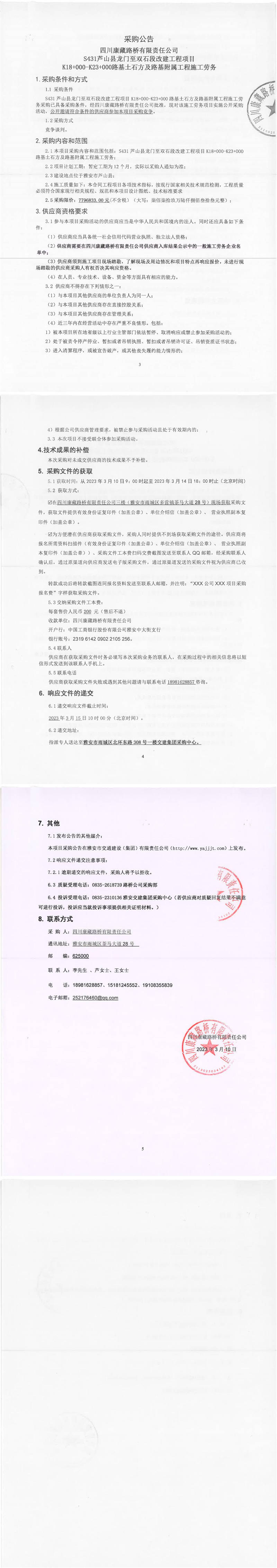 四川康藏路橋有限責(zé)任公司S431蘆山縣龍門至雙石段改建工程項(xiàng)目K18+000-K23+000路基土石方及路基附屬工程施工勞務(wù)采購公告