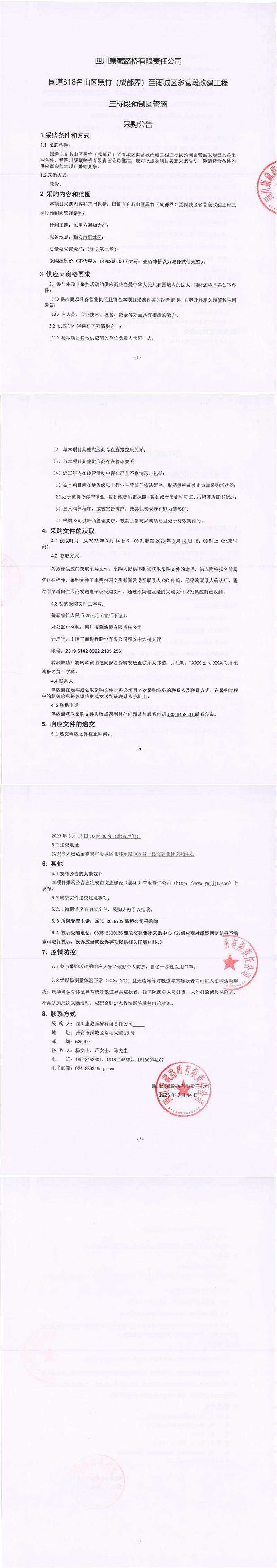 四川康藏路橋有限責(zé)任公司國(guó)道318名山區(qū)黑竹(成都界)至雨城區(qū)多營(yíng)段改建工程三標(biāo)段預(yù)制圓管涵采購(gòu)公告