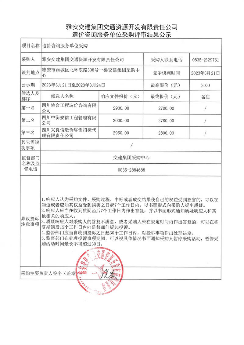 雅安交建集團(tuán)交通資源開(kāi)發(fā)有限責(zé)任公司造價(jià)咨詢服務(wù)單位采購(gòu)評(píng)審結(jié)果公示