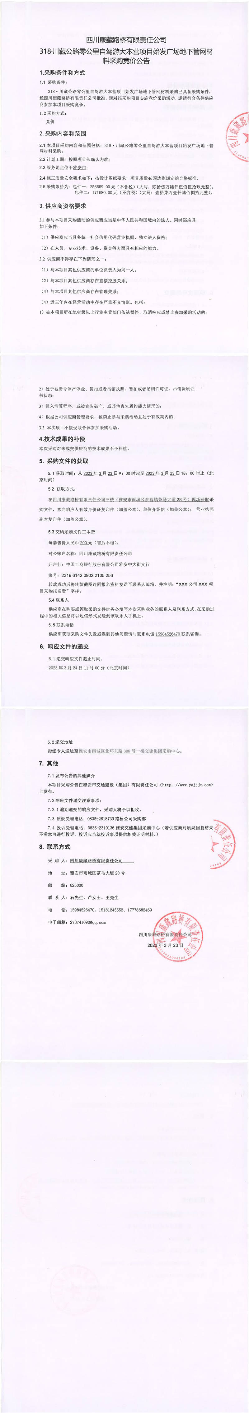 四川康藏路橋有限責(zé)任公司318·川藏公路零公里自駕游大本營項(xiàng)目始發(fā)廣場地下管網(wǎng)材料采購競價(jià)公告