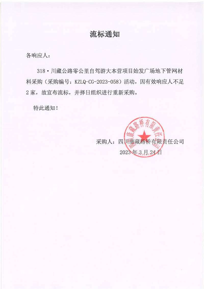四川康藏路橋有限責任公司318·川藏公路零公里自駕游大本營項目始發(fā)廣場地下管網(wǎng)材料采購流標通知