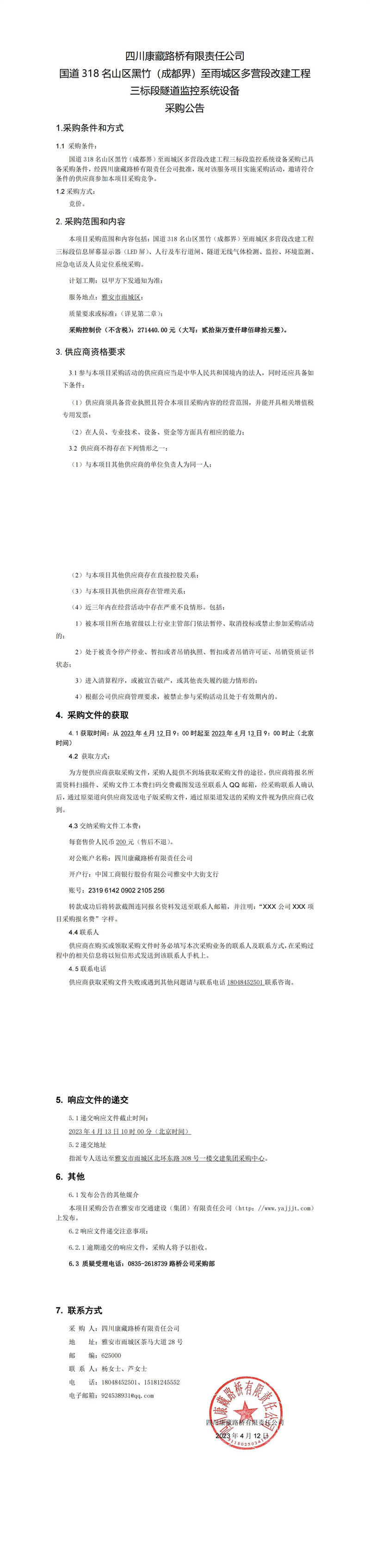 四川康藏路橋有限責(zé)任公司國(guó)道318名山區(qū)黑竹(成都界)至雨城區(qū)多營(yíng)段改建工程三標(biāo)段隧道監(jiān)控系統(tǒng)設(shè)備采購(gòu)公告