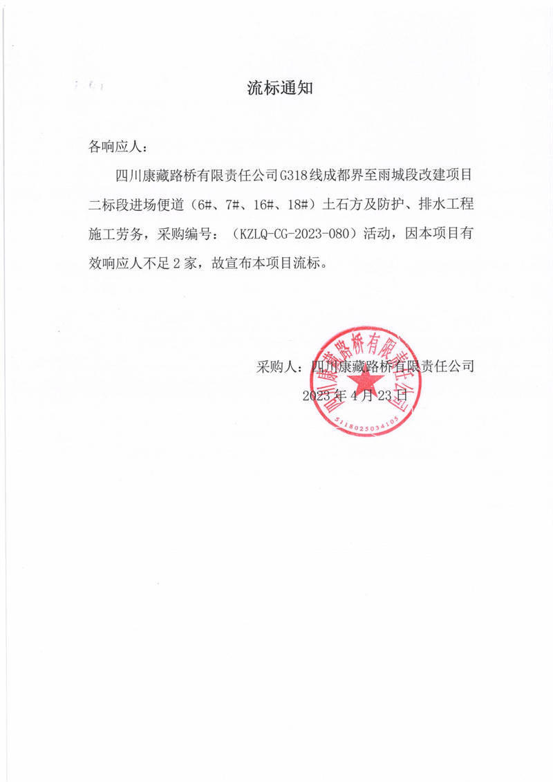 四川康藏路橋有限責(zé)任公司G318線成都至雨城段改建項目二標(biāo)段進場便道(6#、7#、16#、18#)土石方及防護、排水工程施工勞務(wù)流標(biāo)通知