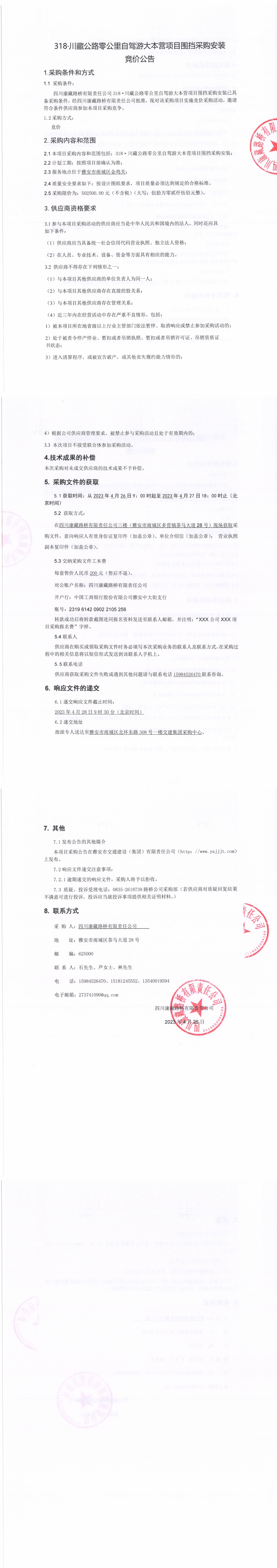 四川康藏路橋有限責(zé)任公司318·川藏公路零公里自駕游大本營項(xiàng)目圍擋采購采購安裝競價(jià)公告