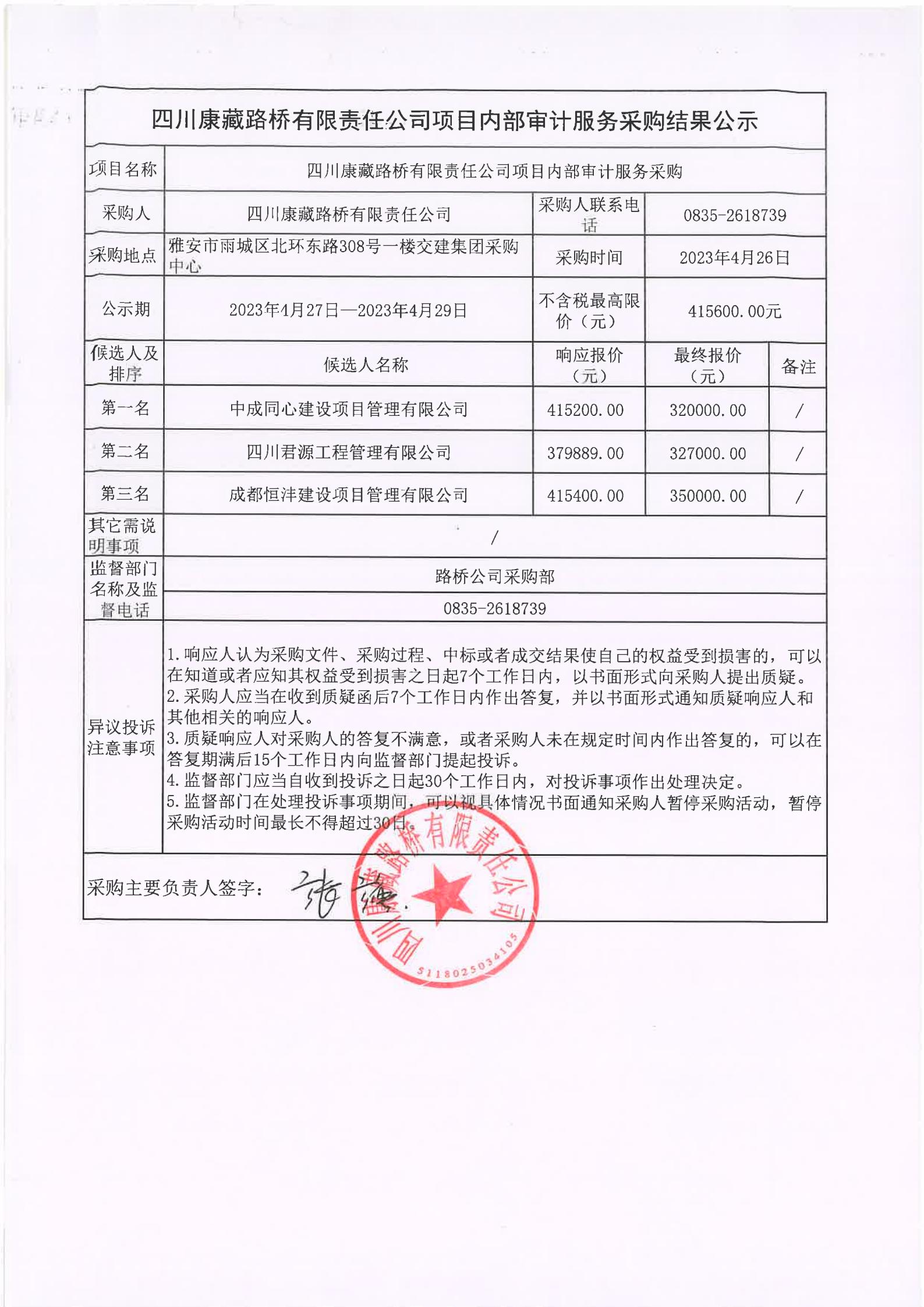 四川康藏路橋有限責(zé)任公司項(xiàng)目?jī)?nèi)部審計(jì)服務(wù)采購(gòu)結(jié)果公示