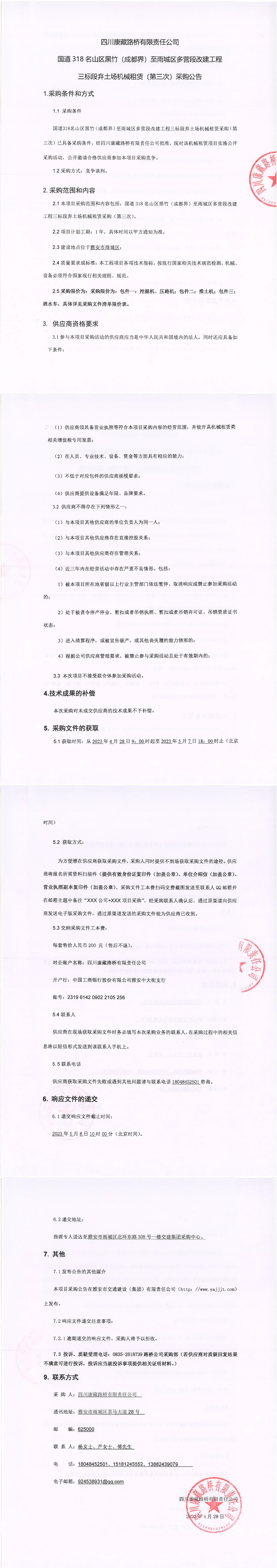 四川康藏路橋有限責(zé)任公司國道318名山區(qū)黑竹(成都界)至雨城區(qū)多營段改建工程三標(biāo)段棄土場機械租賃(第三次)采購公告