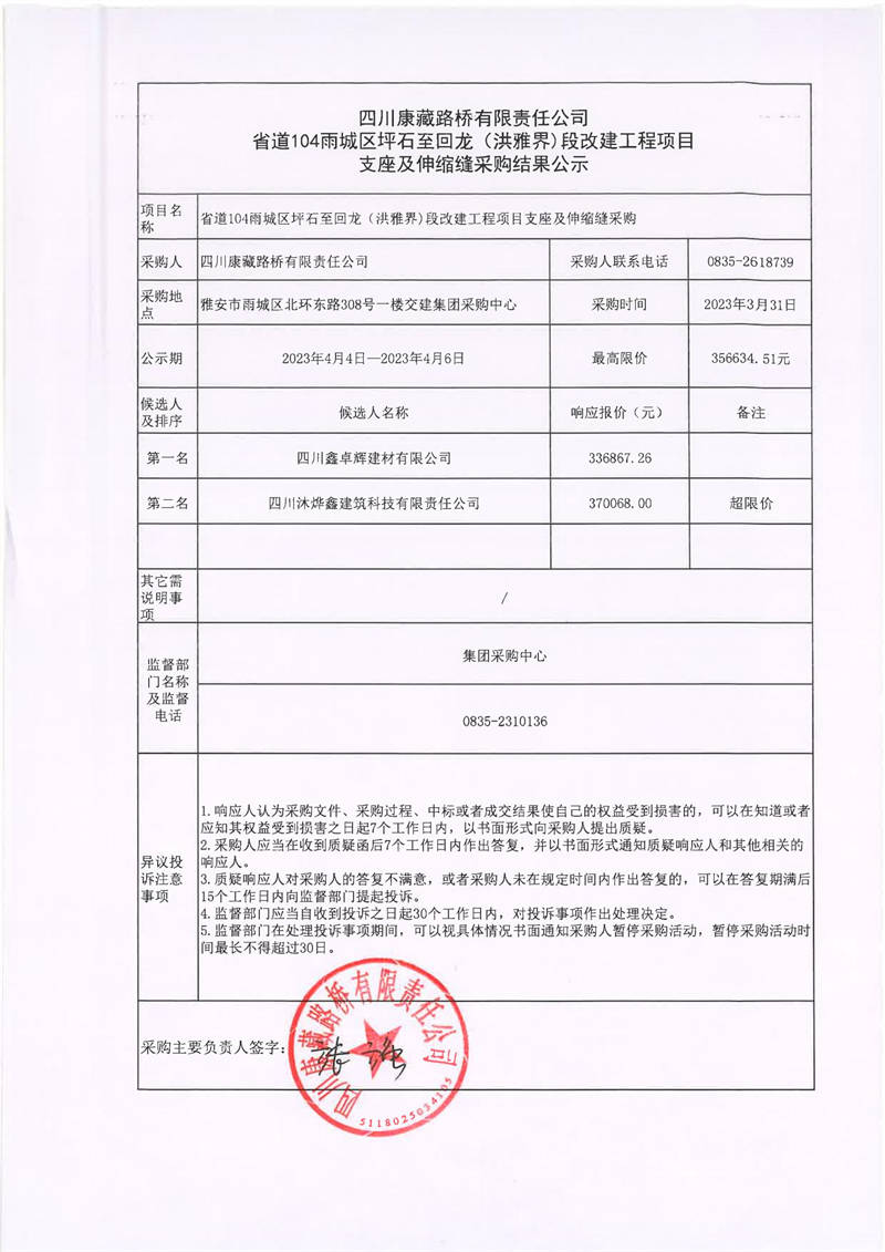 四川康藏路橋有限責(zé)任公司省道104雨城區(qū)坪石至回龍(洪雅界)段改建工程項(xiàng)目支座及伸縮縫采購結(jié)果公示