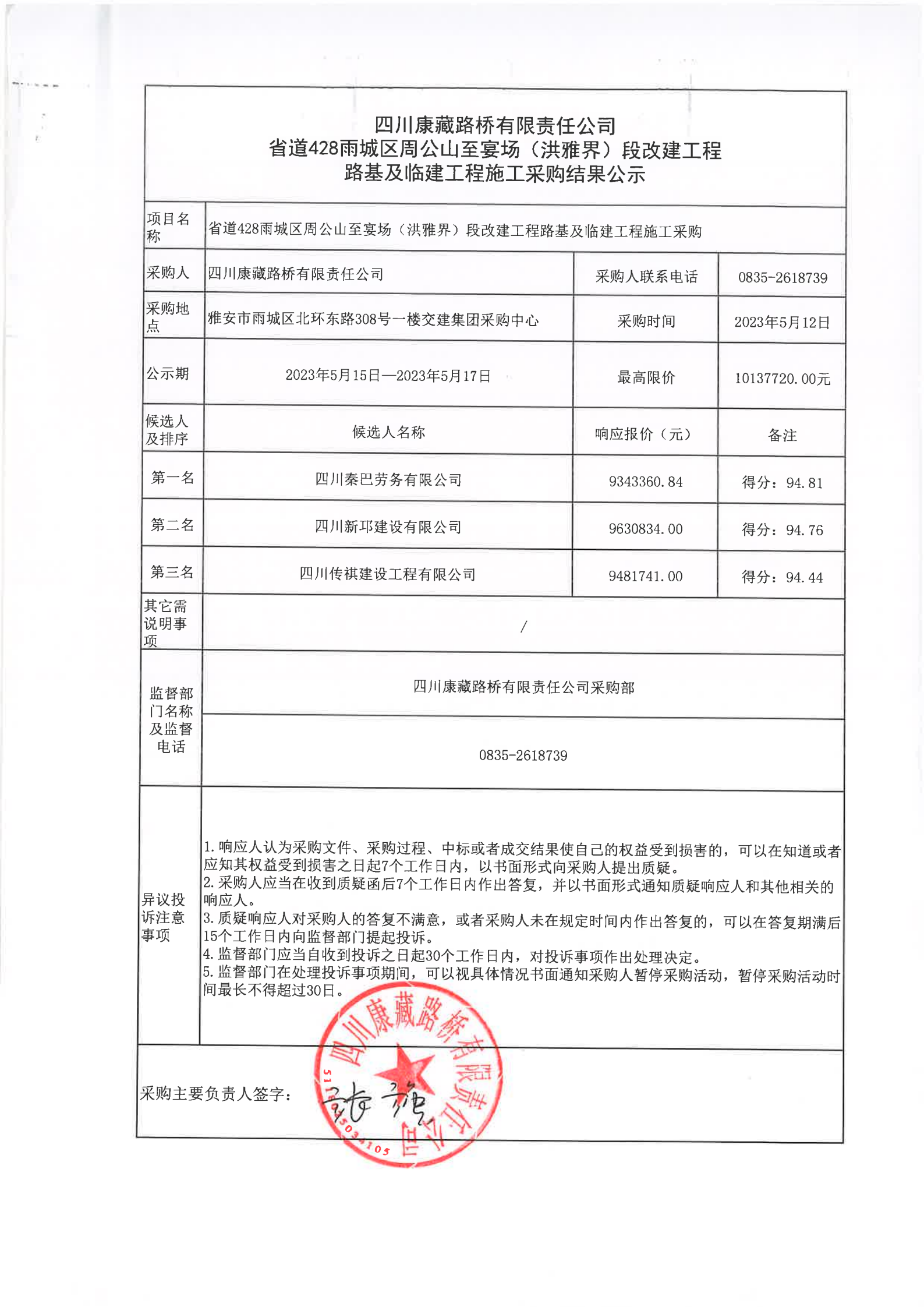 四川康藏路橋有限責(zé)任公司省道428雨城區(qū)周公山至宴場(洪雅界)段改建工程路基及臨建工程施工采購結(jié)果公示