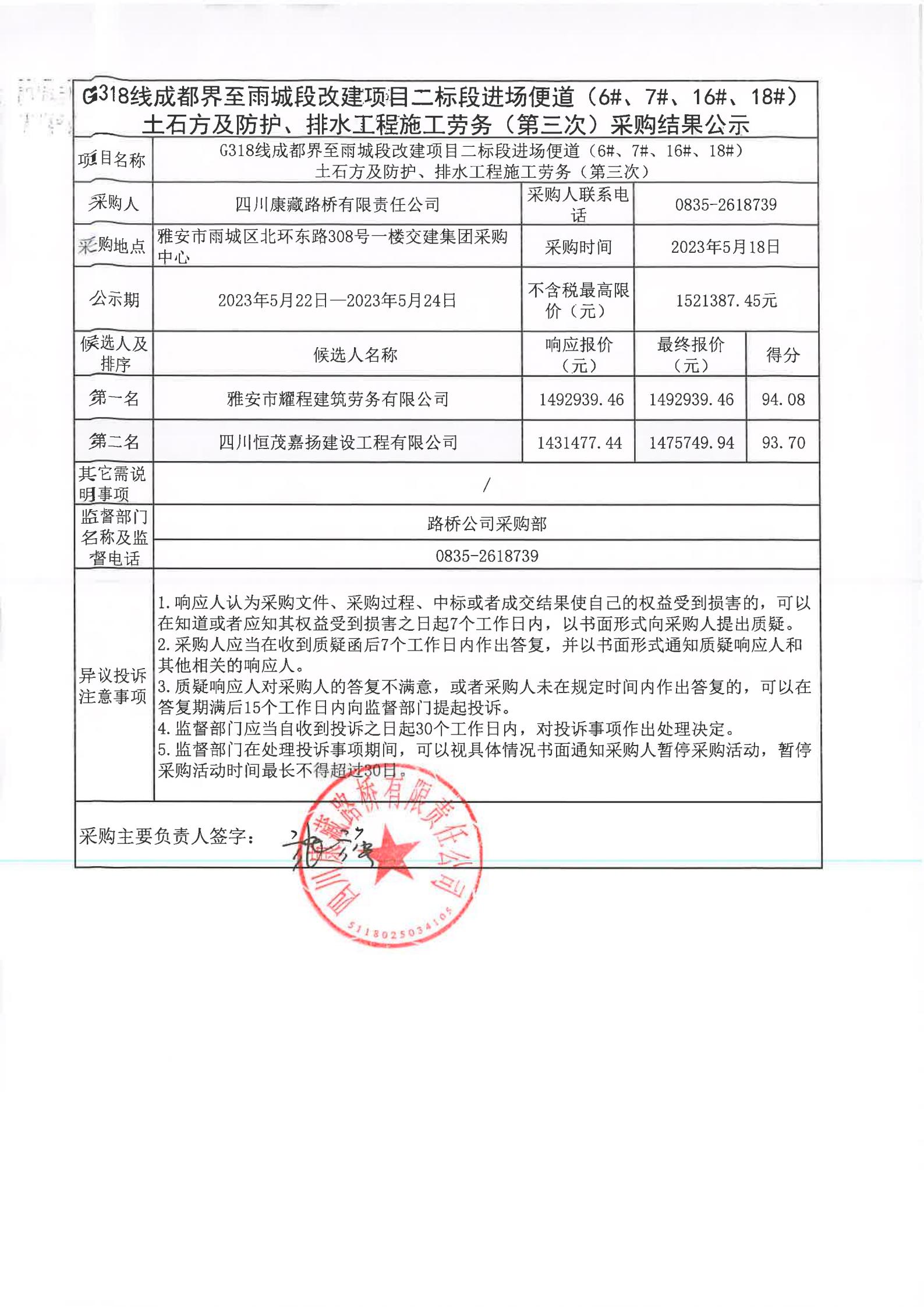 四川康藏路橋有限責(zé)任公司G318線成都至雨城段改建項(xiàng)目二標(biāo)段進(jìn)場便道(6#、7#、16#、18#)土石方及防護(hù)、排水工程施工勞務(wù)(第三次)采購結(jié)果公示