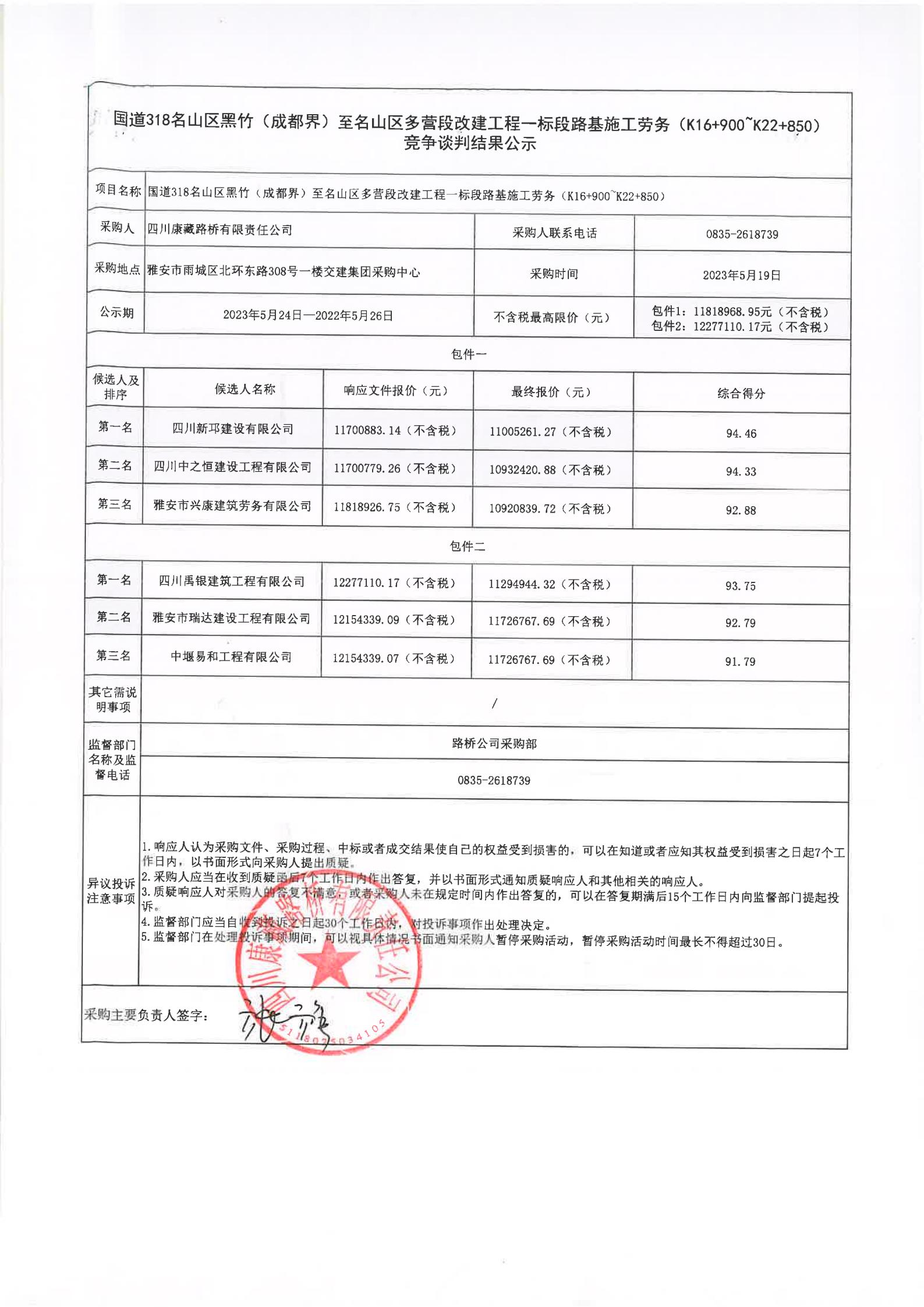 四川康藏路橋有限責任公司國道318名山區(qū)黑竹(成都界)至雨城區(qū)多營段改建工程一標段路基施工勞務(K22+850~K26+604.5)競爭談判結果公示