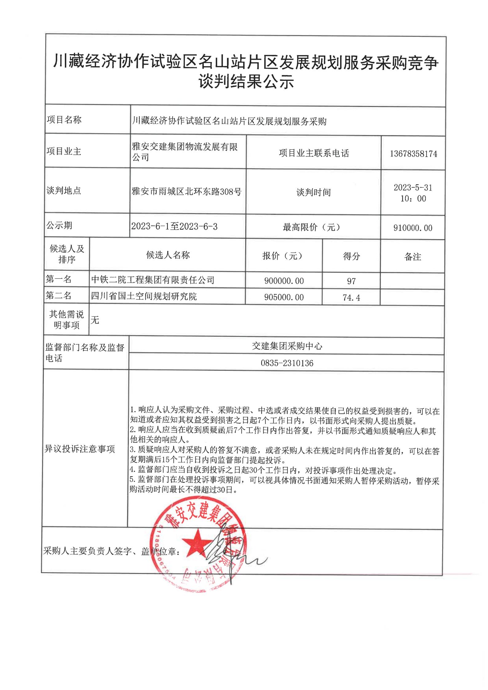 雅安交建集團物流發(fā)展有限公司川藏經(jīng)濟協(xié)作試驗區(qū)名山站片區(qū)發(fā)展規(guī)劃編制服務(wù)采購競爭談判結(jié)果公示