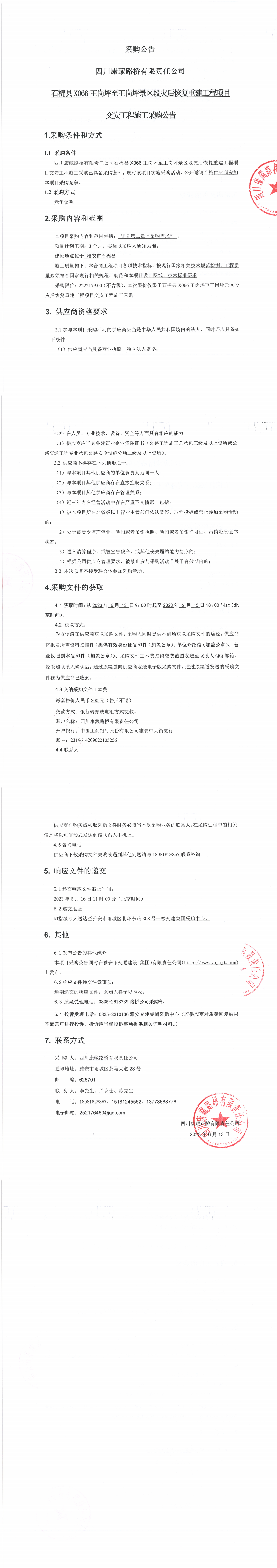 四川康藏路橋有限責(zé)任公司石棉縣X066王崗坪至王崗坪景區(qū)段災(zāi)后恢復(fù)重建工程項(xiàng)目交安工程施工采購(gòu)公告