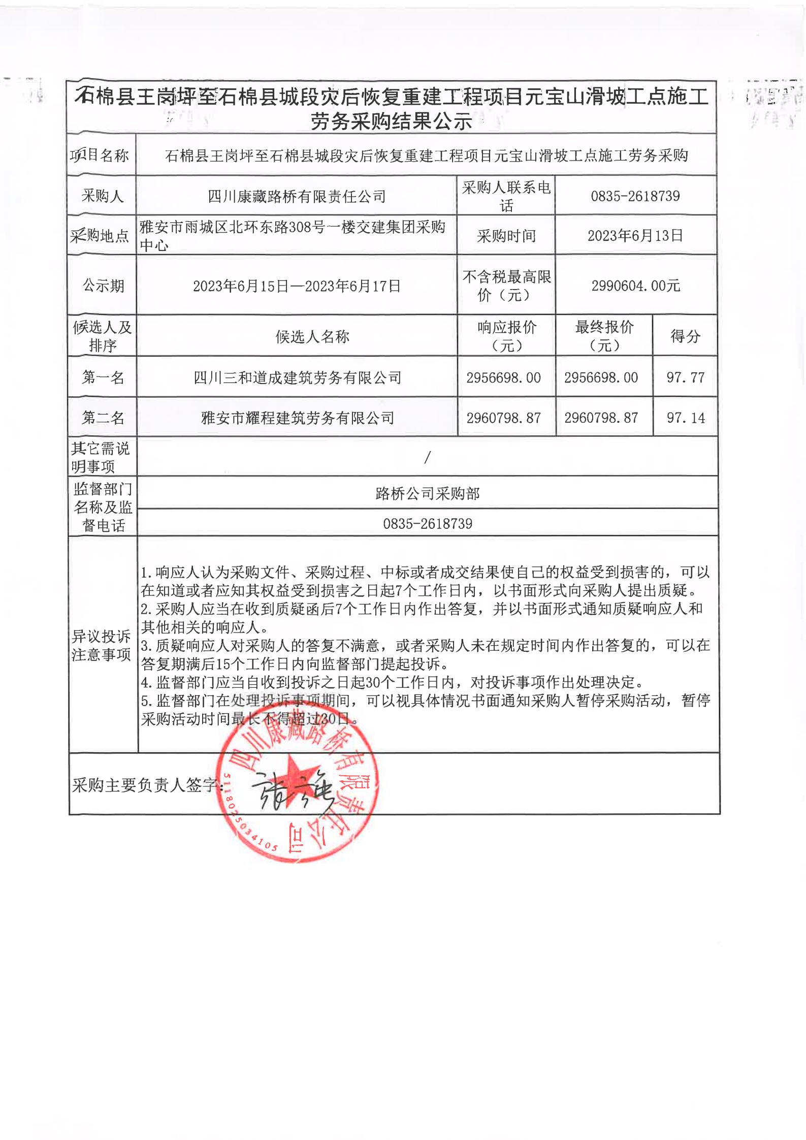 四川康藏路橋有限責(zé)任公司石棉縣王崗坪至石棉縣城段災(zāi)后恢復(fù)重建工程項目元寶山滑坡工點施工勞務(wù)采購結(jié)果公示