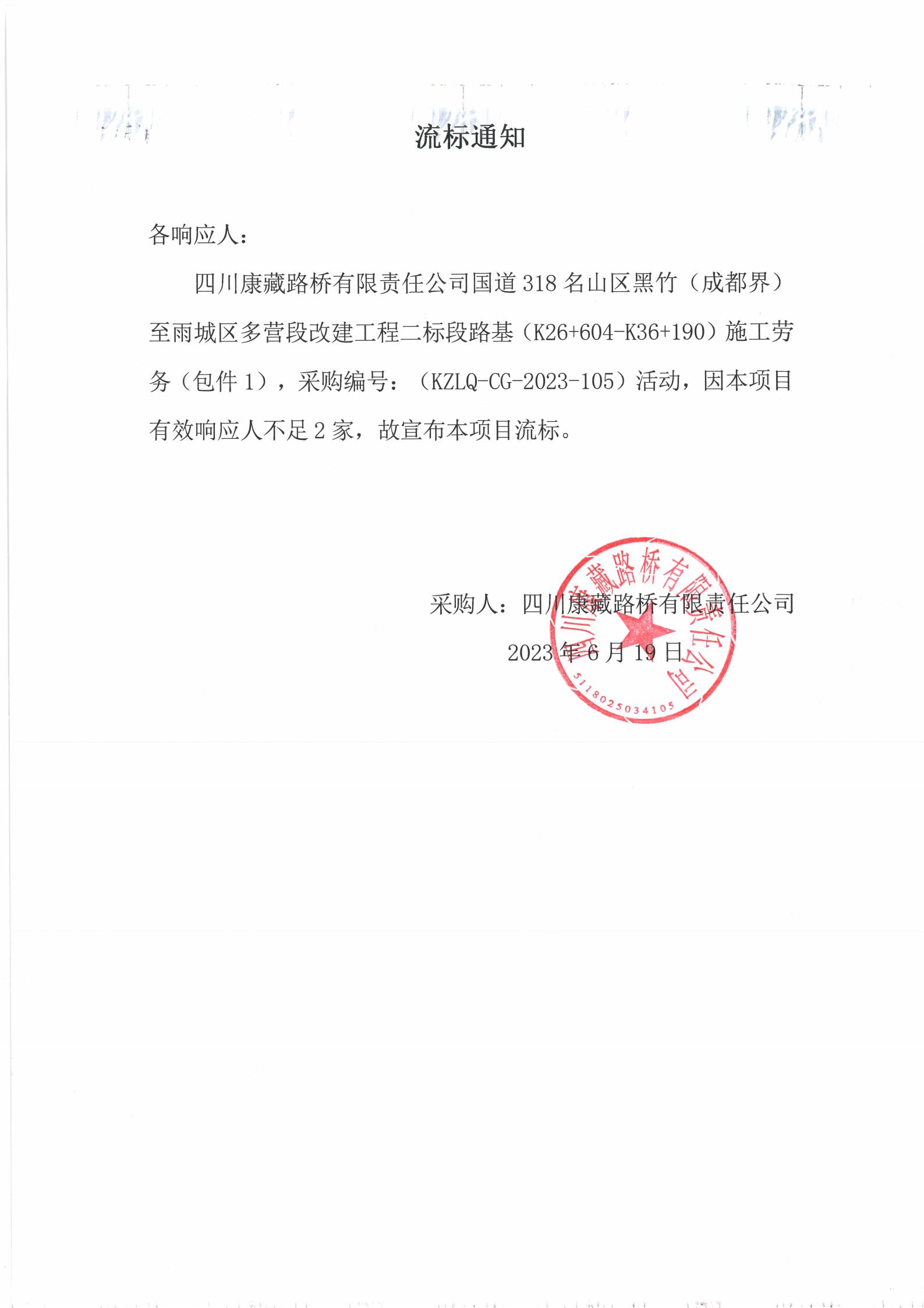 四川康藏路橋有限責任公司國道318名山區(qū)黑竹(成都界)至雨城區(qū)多營段改建工程二標段路基(K26+604-K36+190)施工勞務(wù)采購(包件1)流標通知