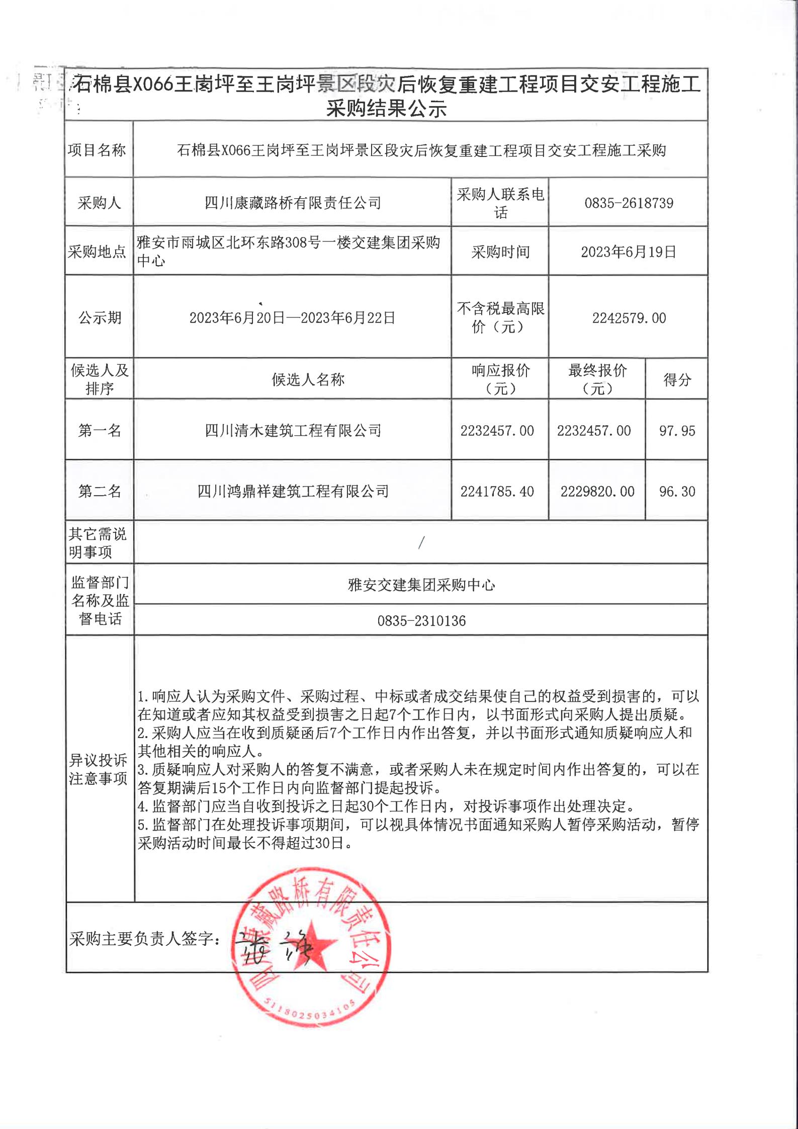 四川康藏路橋有限責(zé)任公司石棉縣X066王崗坪至王崗坪景區(qū)段災(zāi)后恢復(fù)重建工程項(xiàng)目交安工程施工采購結(jié)果公示