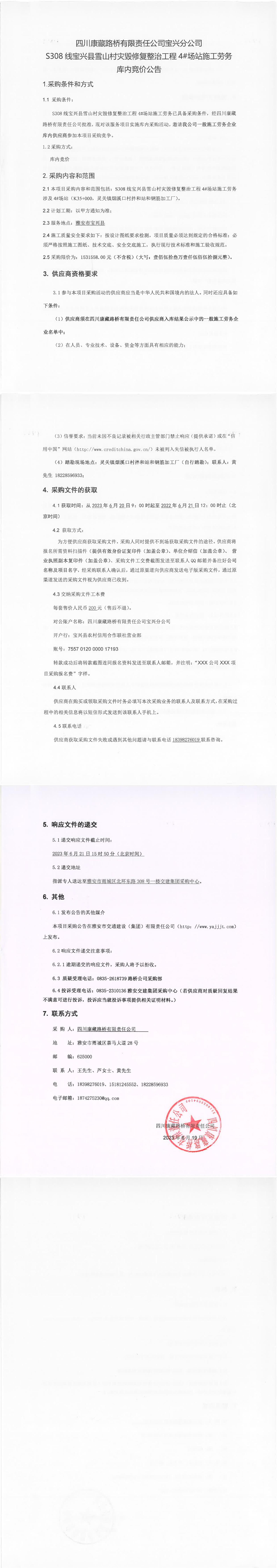 四川康藏路橋有限責(zé)任公司寶興分公司S308線寶興縣雪山村災(zāi)毀整治工程4#場站施工勞務(wù)庫內(nèi)競價(jià)公告