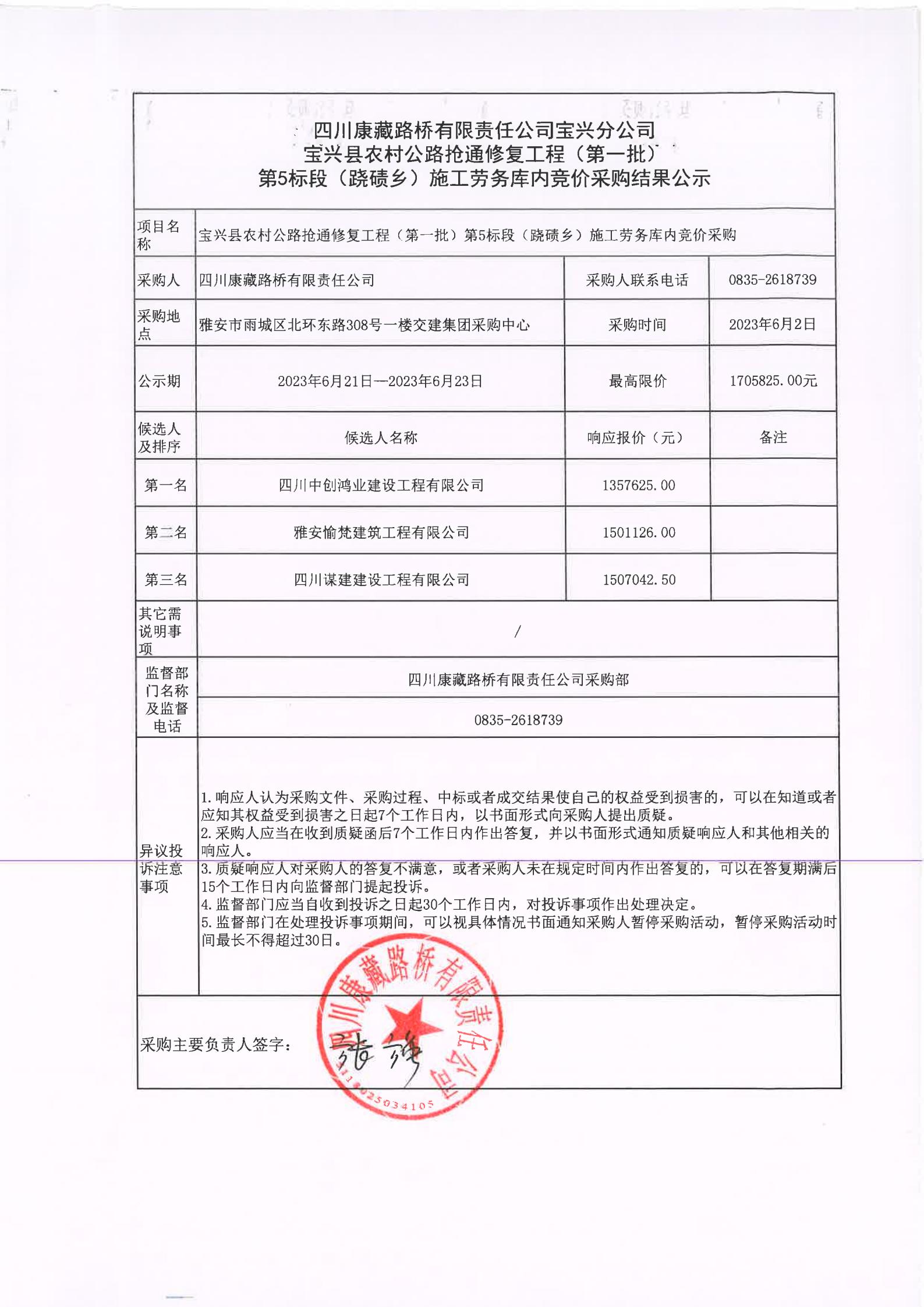 四川康藏路橋有限責(zé)任公司寶興分公司寶興縣農(nóng)村公路搶通修復(fù)工程(第一批)第5標(biāo)段(蹺磧鄉(xiāng))施工勞務(wù)庫內(nèi)競(jìng)價(jià)采購結(jié)果公示