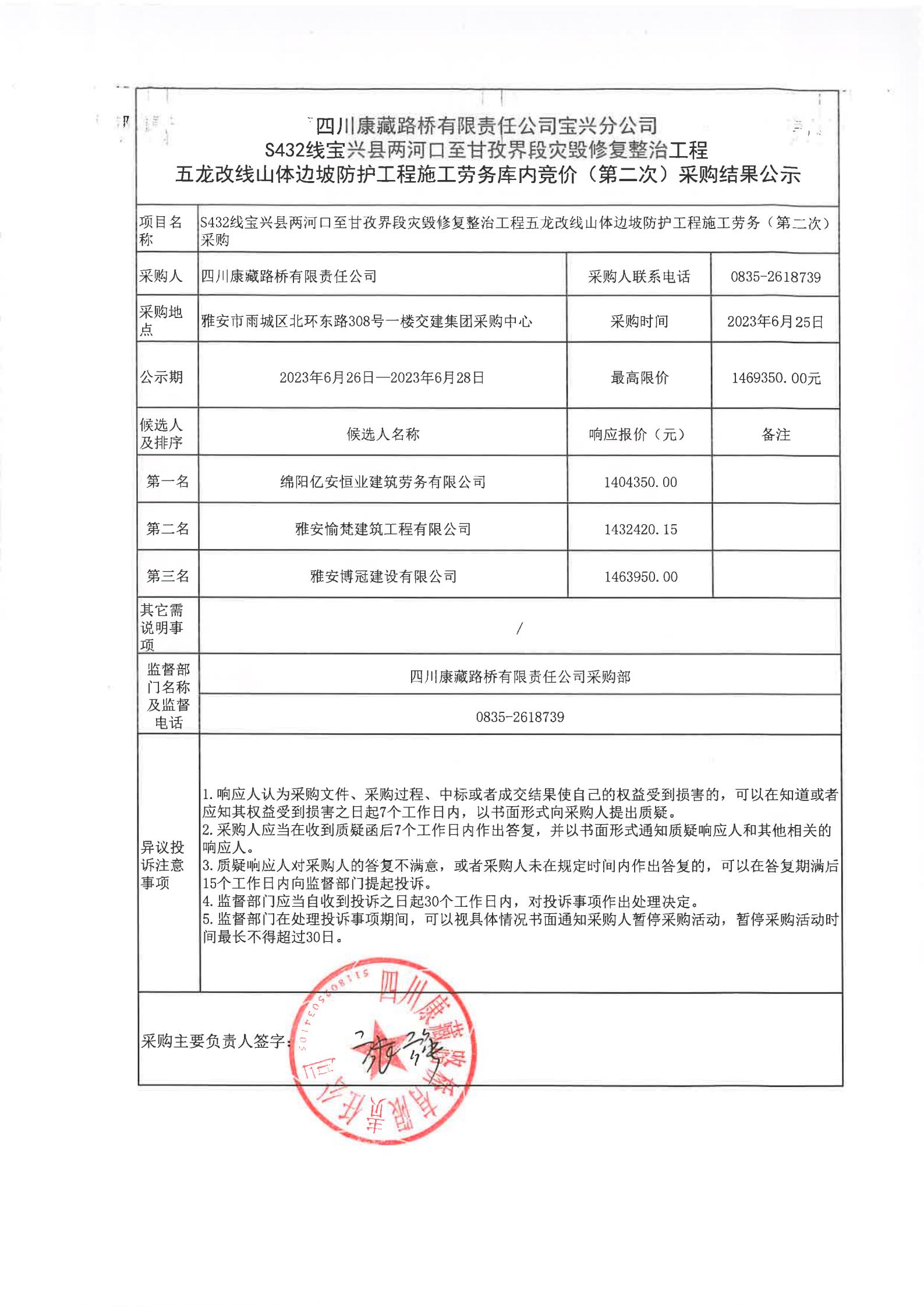 四川康藏路橋有限責(zé)任公司寶興分公司S432寶興縣兩河口至甘孜界段災(zāi)毀修復(fù)整治工程五龍改線山體邊坡防護(hù)工程施工勞務(wù)庫內(nèi)競價(第二次)結(jié)果公示