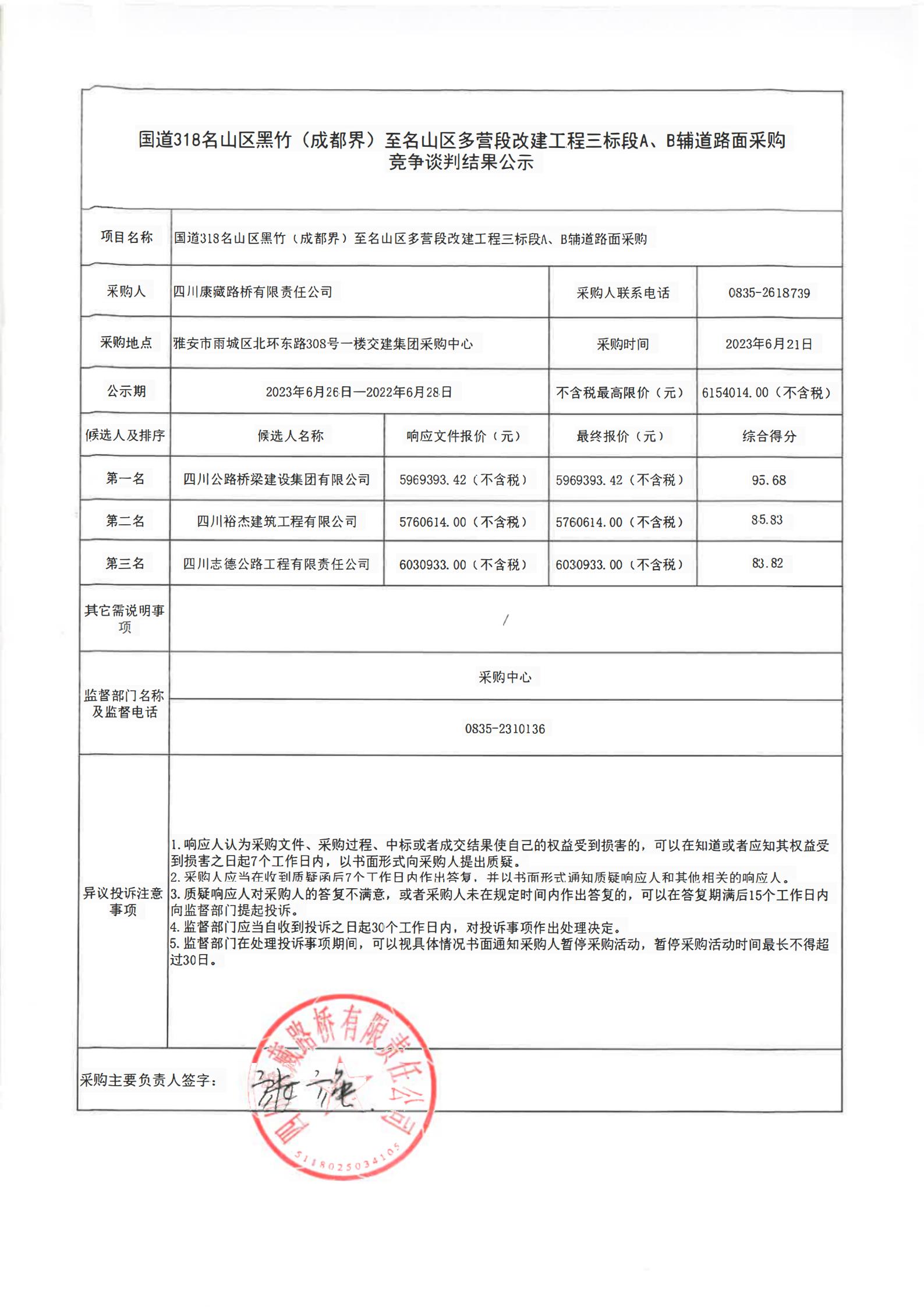 四川康藏路橋有限責(zé)任公司國道318名山區(qū)黑竹(成都界)至雨城區(qū)多營段改建工程三標(biāo)段A、B輔道路面采購競爭談判結(jié)果公示