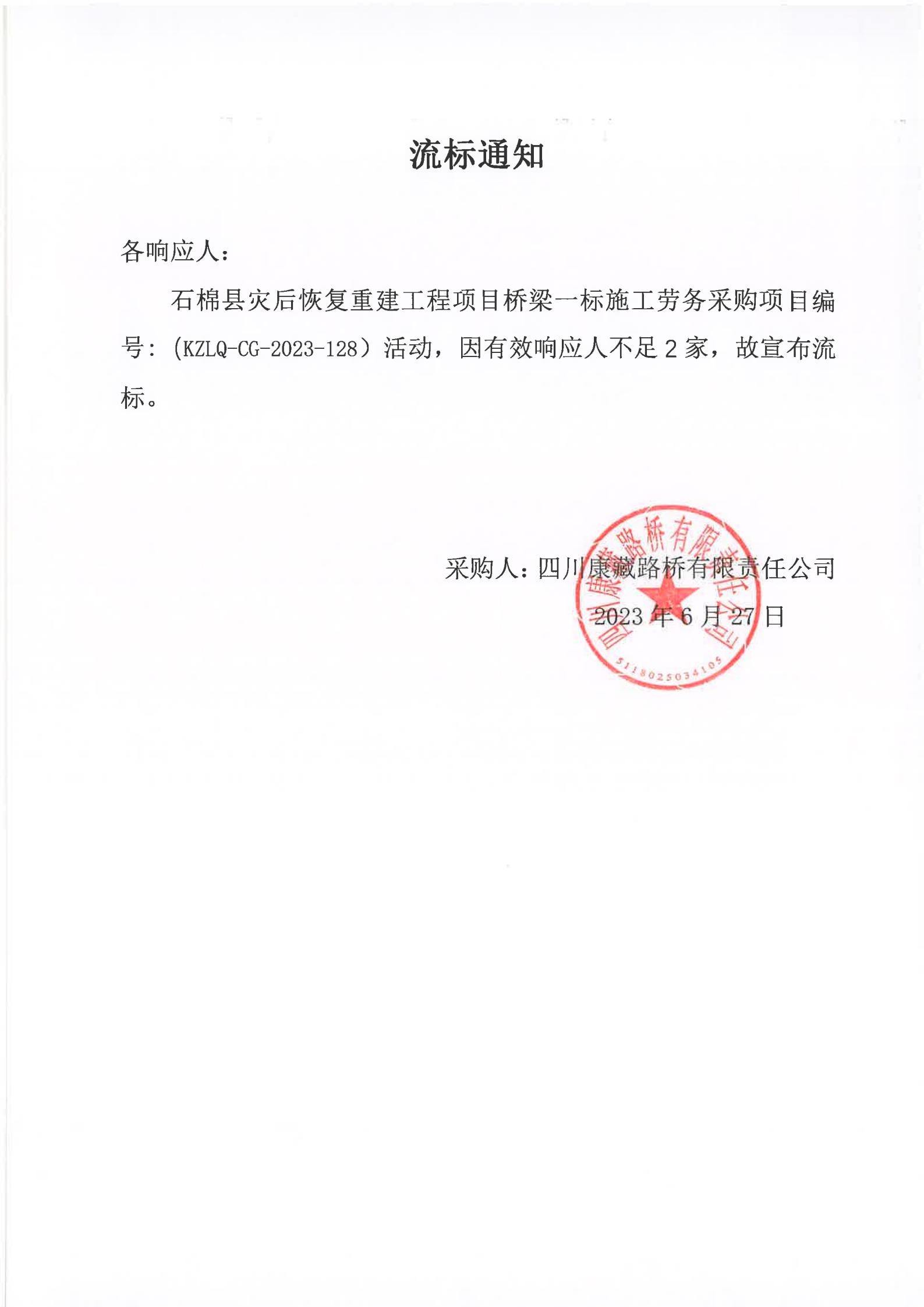 四川康藏路橋有限責(zé)任公司石棉縣災(zāi)后恢復(fù)重建工程項目橋梁一標施工勞務(wù)采購流標通知