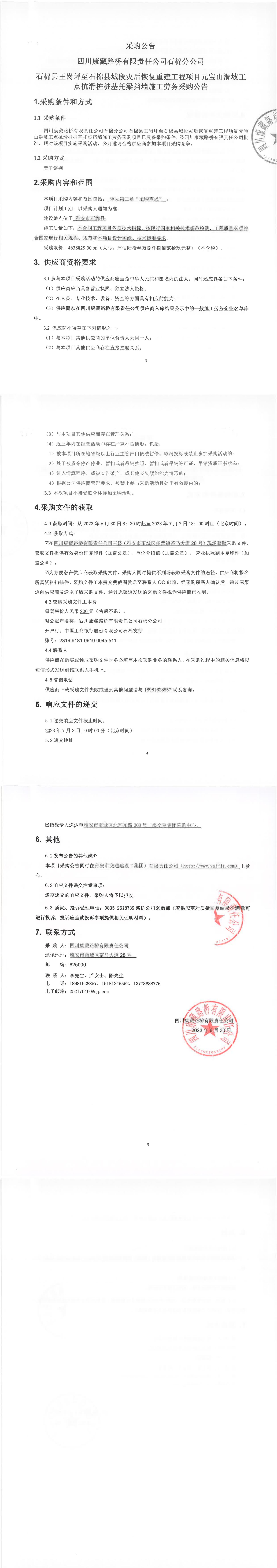 四川康藏路橋有限責(zé)任公司石棉縣王崗坪至石棉縣城段災(zāi)后恢復(fù)重建工程項(xiàng)目元寶山滑坡工點(diǎn)抗滑樁樁基托梁擋墻施工勞務(wù)采購公告
