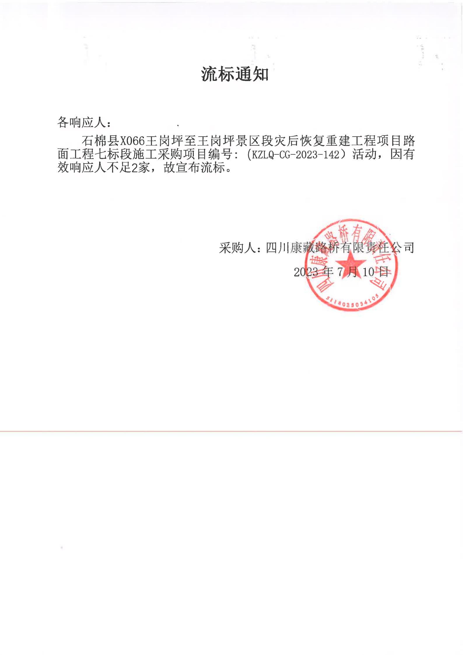 四川康藏路橋有限責任公司石棉縣X066王崗坪至王崗坪景區(qū)段災后恢復重建工程項目路面工程七標段施工采購流標通知