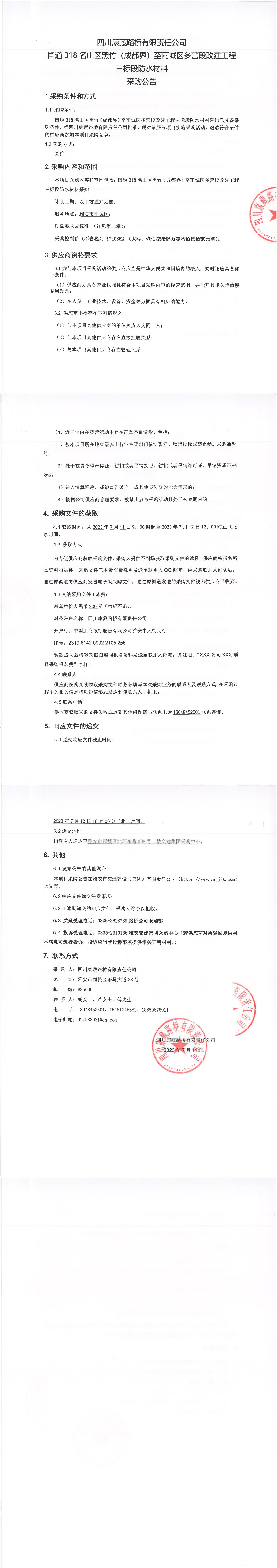 四川康藏路橋有限責(zé)任公司國道318名山區(qū)黑竹(成都界)至雨城區(qū)多營段改建工程三標(biāo)段防水材料采購公告