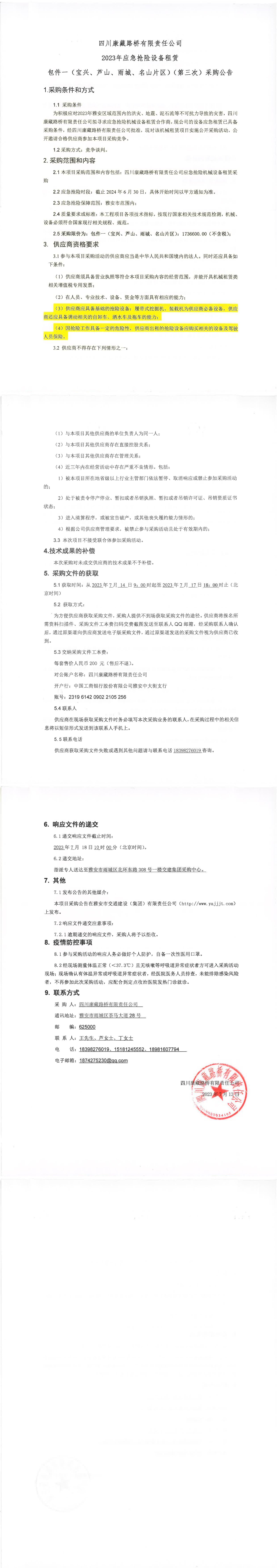 四川康藏路橋有限責任公司2023年應(yīng)急搶險設(shè)備租賃包件一(寶興、蘆山、雨城、名山片區(qū))(第三次)采購公告