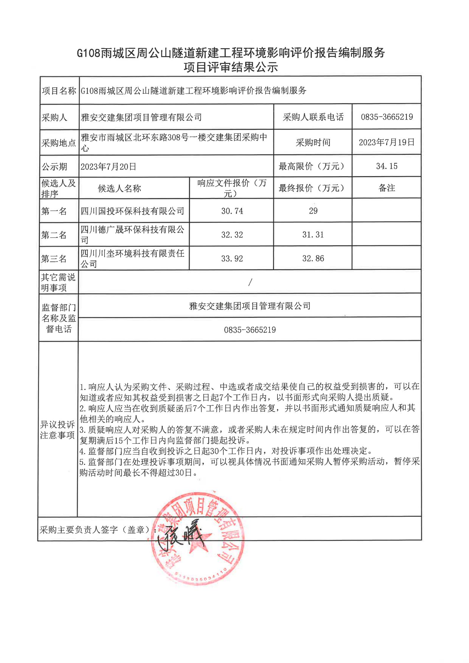 雅安交建集團(tuán)項目管理有限公司G108雨城區(qū)周公山隧道新建工程環(huán)境影響評價報告編制服務(wù)項目評審結(jié)果公示