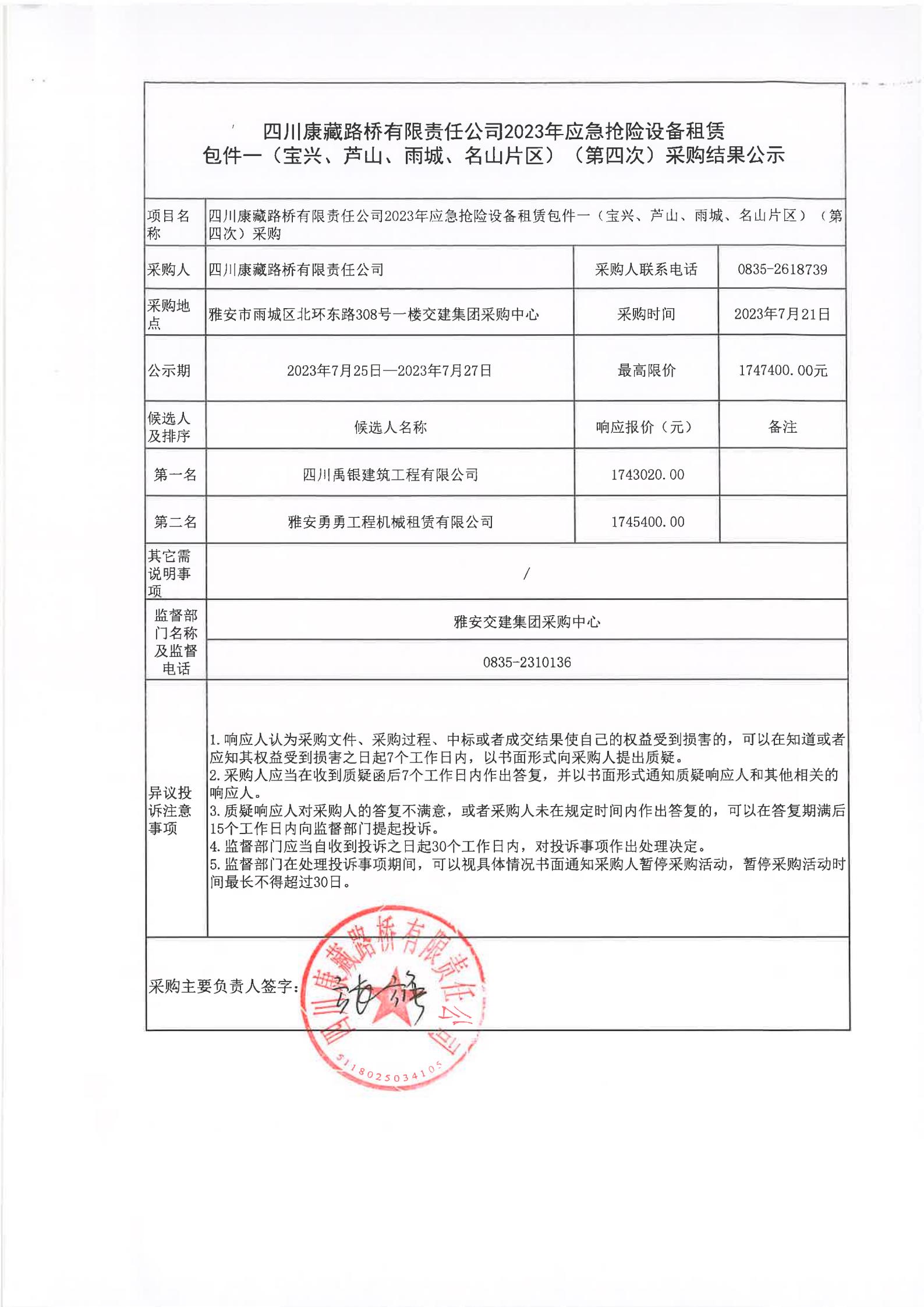 四川康藏路橋有限責(zé)任公司2023年應(yīng)急搶險(xiǎn)設(shè)備租賃包件一(寶興、蘆山、雨城、名山片區(qū))(第四次)采購(gòu)結(jié)果公示