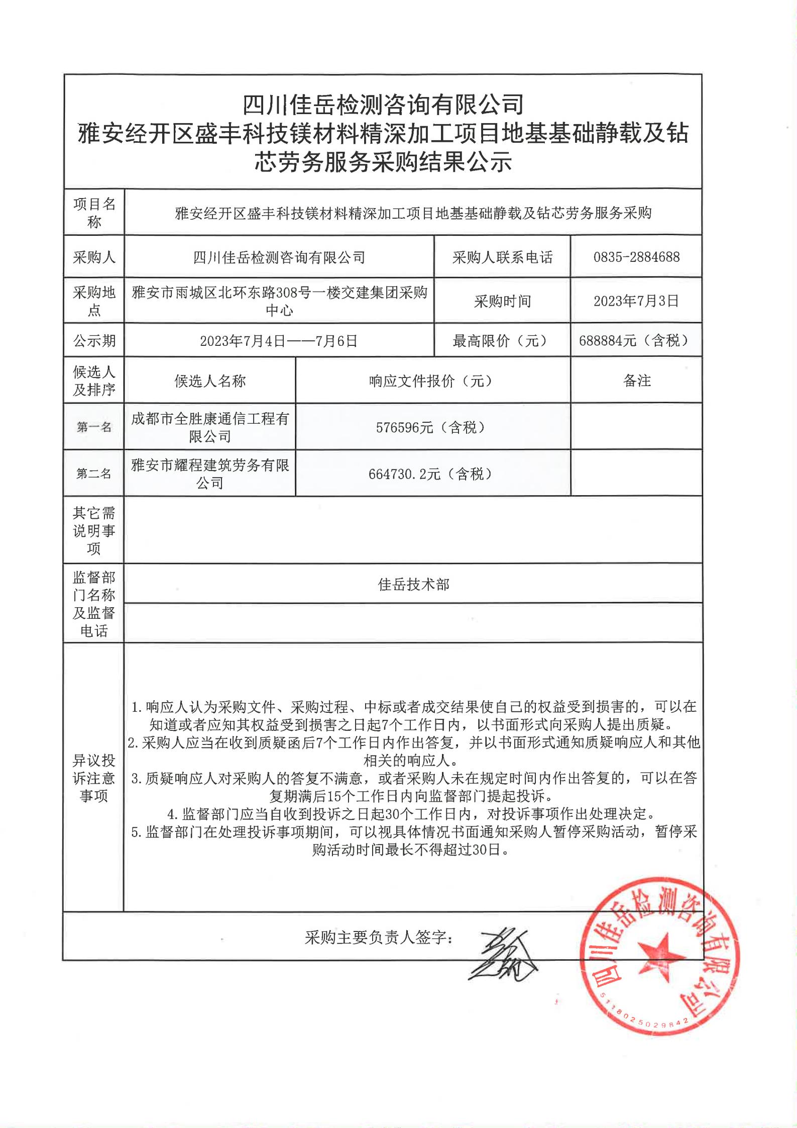 四川佳岳檢測咨詢有限公司雅安經開區(qū)盛豐科技鎂材料精深加工項目地基基礎靜載及鉆芯服務采購結果公示