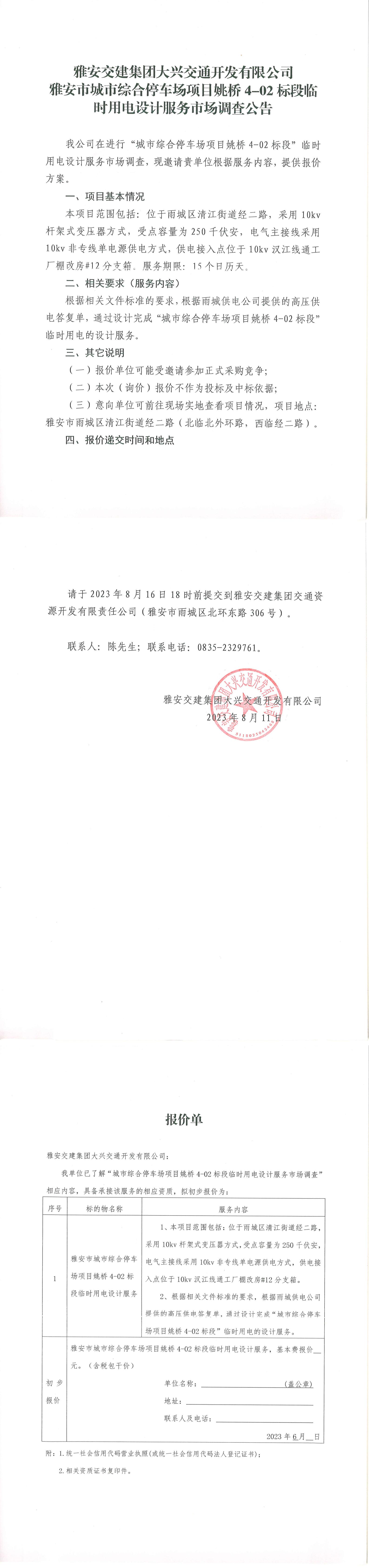 雅安交建集團(tuán)大興交通開發(fā)有限公司雅安市城市綜合停車場項(xiàng)目姚橋4-02標(biāo)段臨時用電設(shè)計服務(wù)市場調(diào)查公告