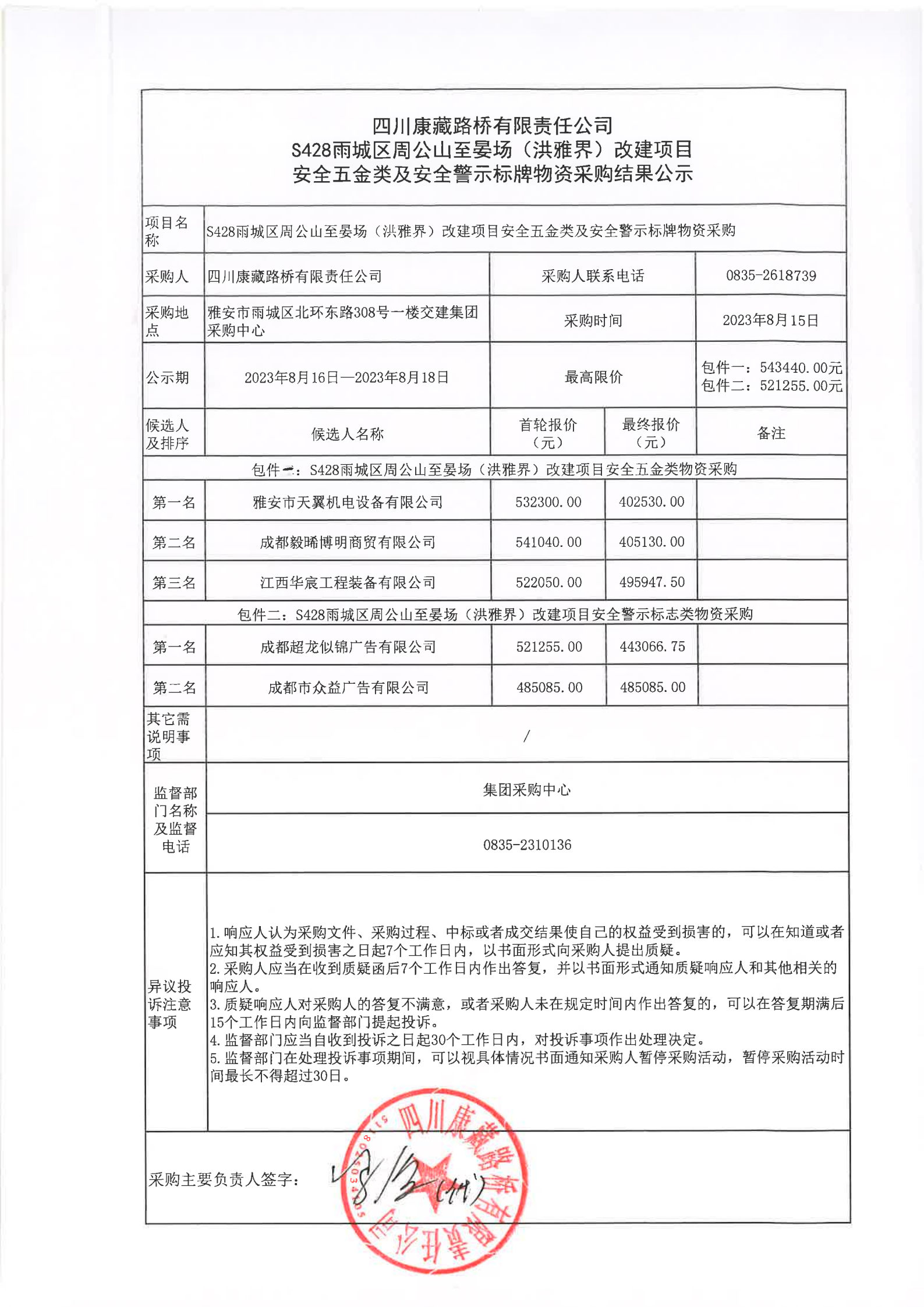 四川康藏路橋有限責(zé)任公司S428雨城區(qū)周公山至晏場(洪雅界)改建項(xiàng)目安全五金類及安全警示標(biāo)牌物資采購結(jié)果公示