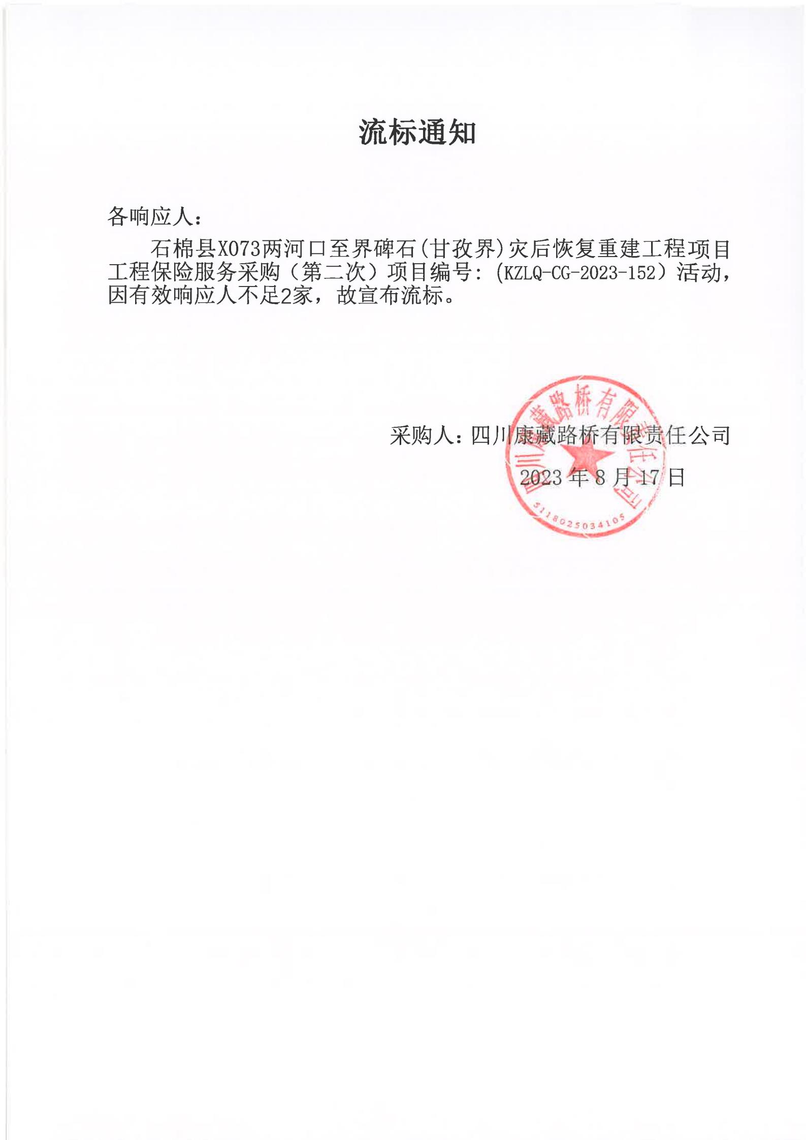 四川康藏路橋有限責(zé)任公司石棉縣X073兩河口至界碑石(甘孜界)災(zāi)后恢復(fù)重建工程項(xiàng)目工程保險(xiǎn)服務(wù)采購(第二次)流標(biāo)通知