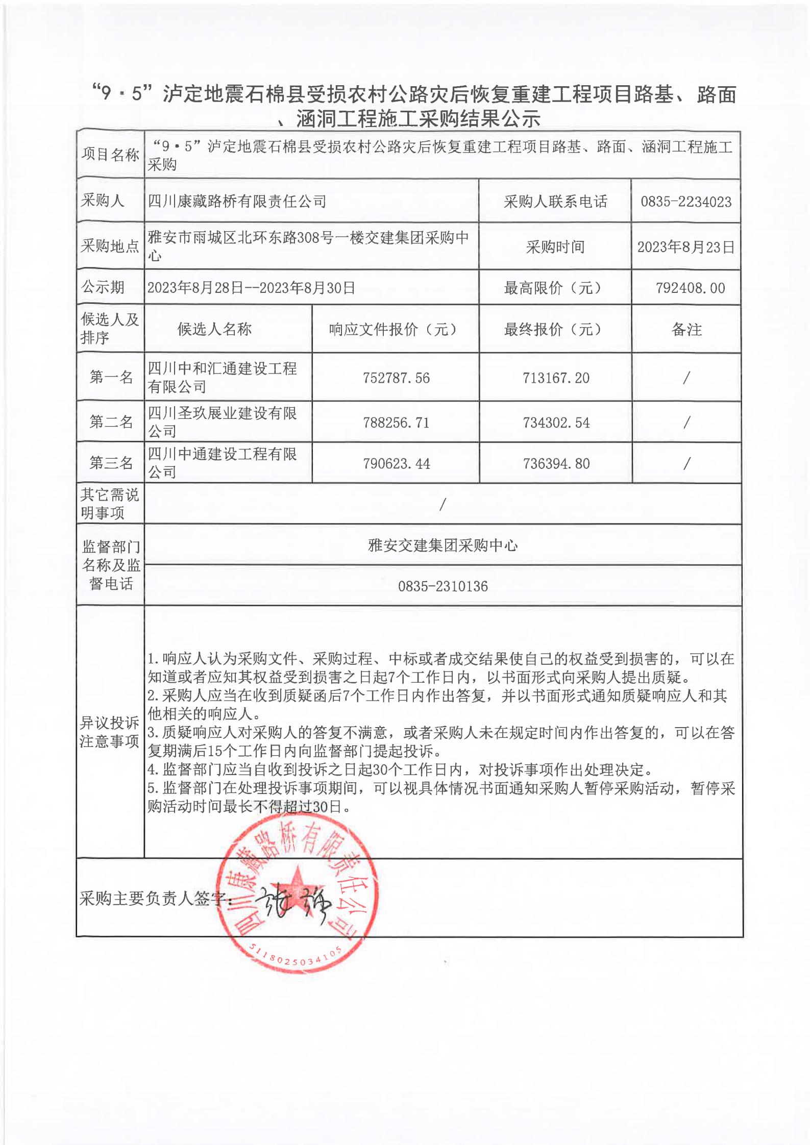 四川康藏路橋有限責(zé)任公司“9·5”瀘定地震石棉縣受損農(nóng)村公路災(zāi)后恢復(fù)重建工程項(xiàng)目路基、路面、涵洞工程施工采購(gòu)結(jié)果公示
