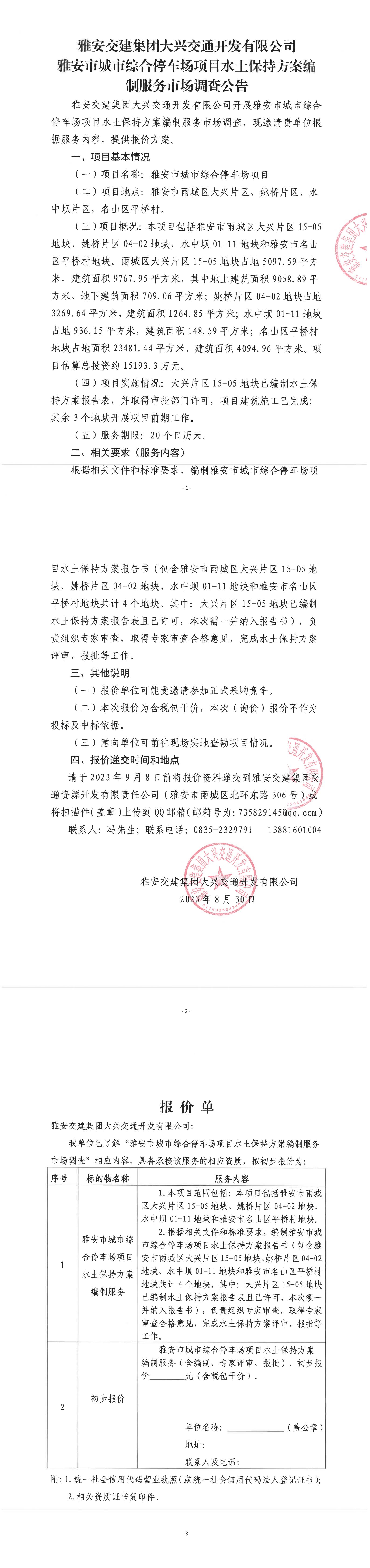 雅安交建集團(tuán)大興交通開(kāi)發(fā)有限公司雅安市城市綜合停車(chē)場(chǎng)項(xiàng)目水土保持方案編制服務(wù)市場(chǎng)調(diào)查公告