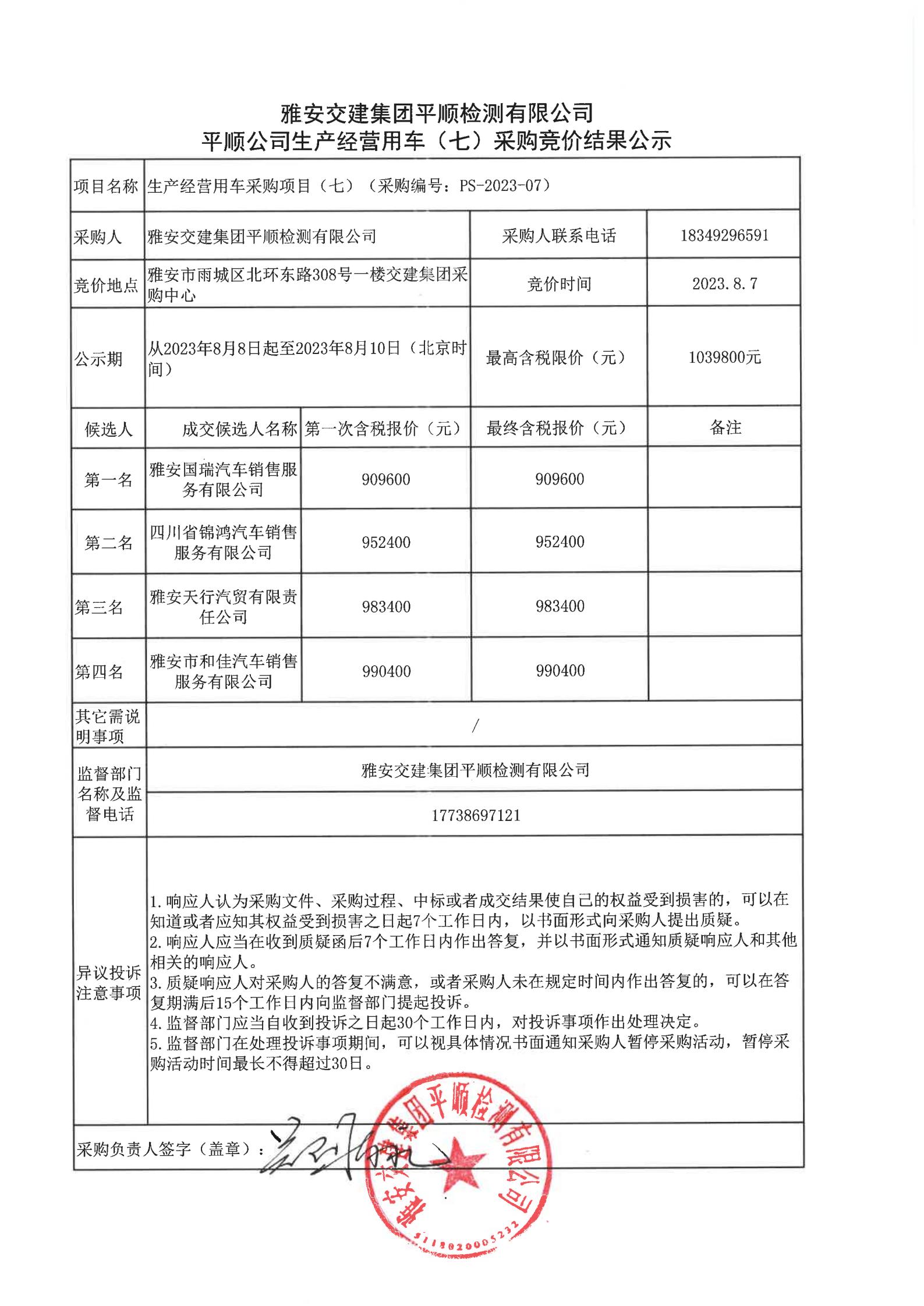 雅安交建集團(tuán)平順檢測有限公司平順公司生產(chǎn)經(jīng)營用車(七)采購競價結(jié)果公示