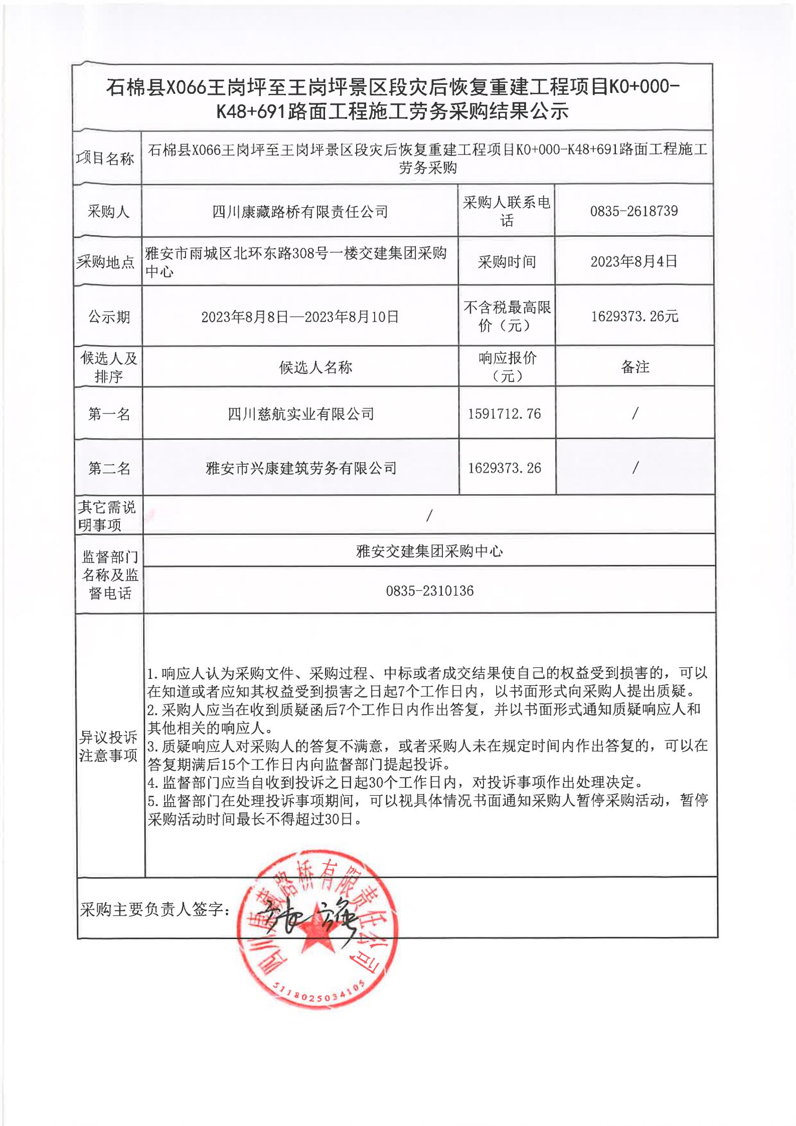 四川康藏路橋有限責任公司石棉縣X066王崗坪至王崗坪景區(qū)段災(zāi)后恢復(fù)重建工程項目K0+000-K48+691路面工程施工勞務(wù)采購結(jié)果公示
