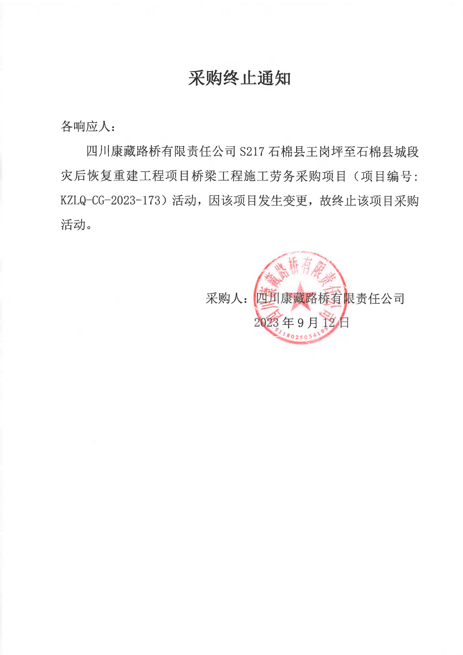 四川康藏路橋有限責(zé)任公司S217石棉縣王崗坪至石棉縣城段災(zāi)后恢復(fù)重建工程項(xiàng)目橋梁工程施工勞務(wù)項(xiàng)目采購(gòu)終止通知