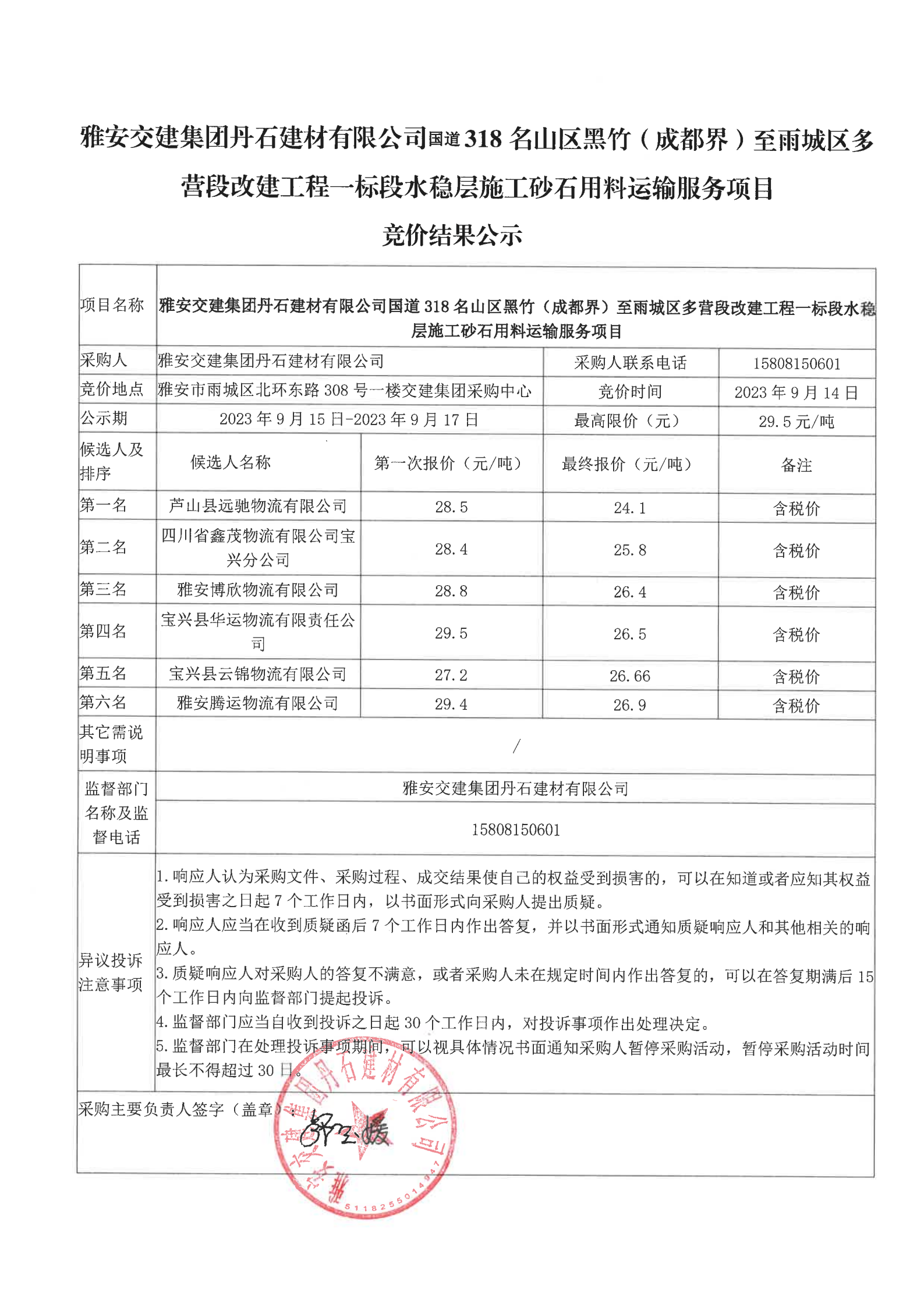 雅安交建集團(tuán)丹石建材有限公司國(guó)道318名山區(qū)黑竹(成都界)至雨城區(qū)多營(yíng)段改建工程一標(biāo)段水穩(wěn)層施工砂石用料運(yùn)輸服務(wù)項(xiàng)目競(jìng)價(jià)結(jié)果公示
