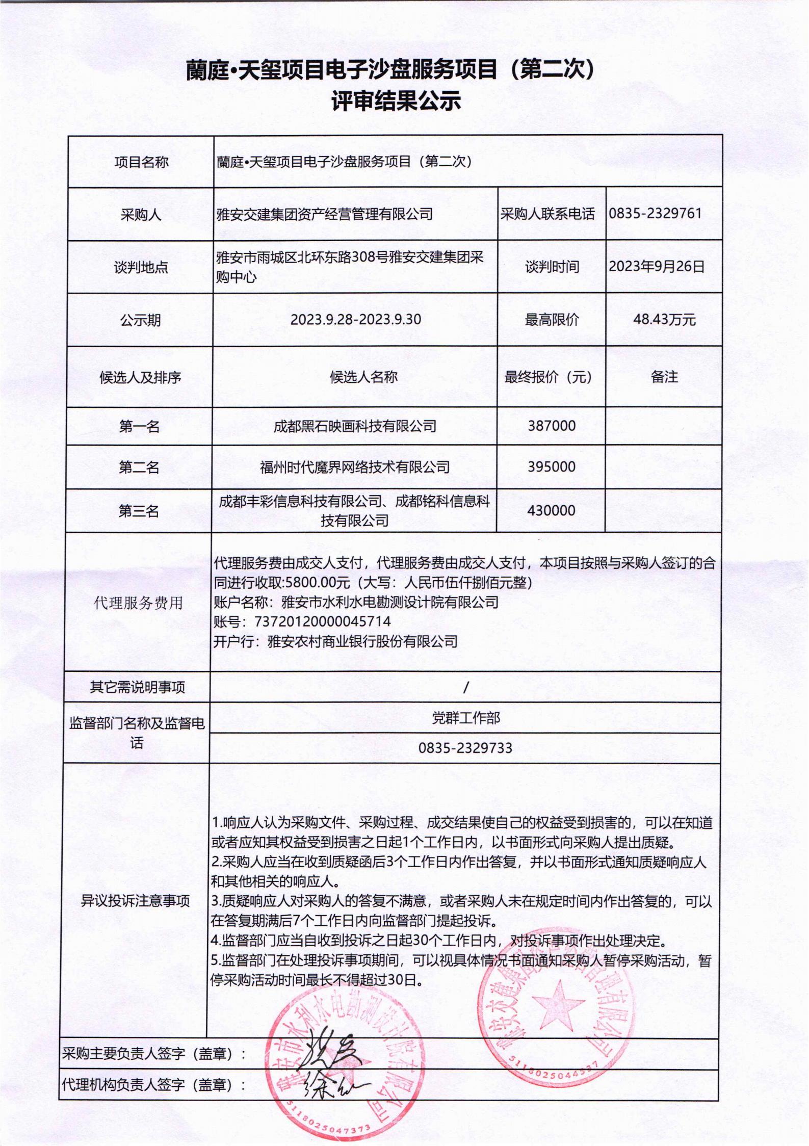 雅安交建集團資產(chǎn)經(jīng)營管理有限公司蘭庭•天璽項目電子沙盤服務(wù)項目(第二次)評審結(jié)果公示