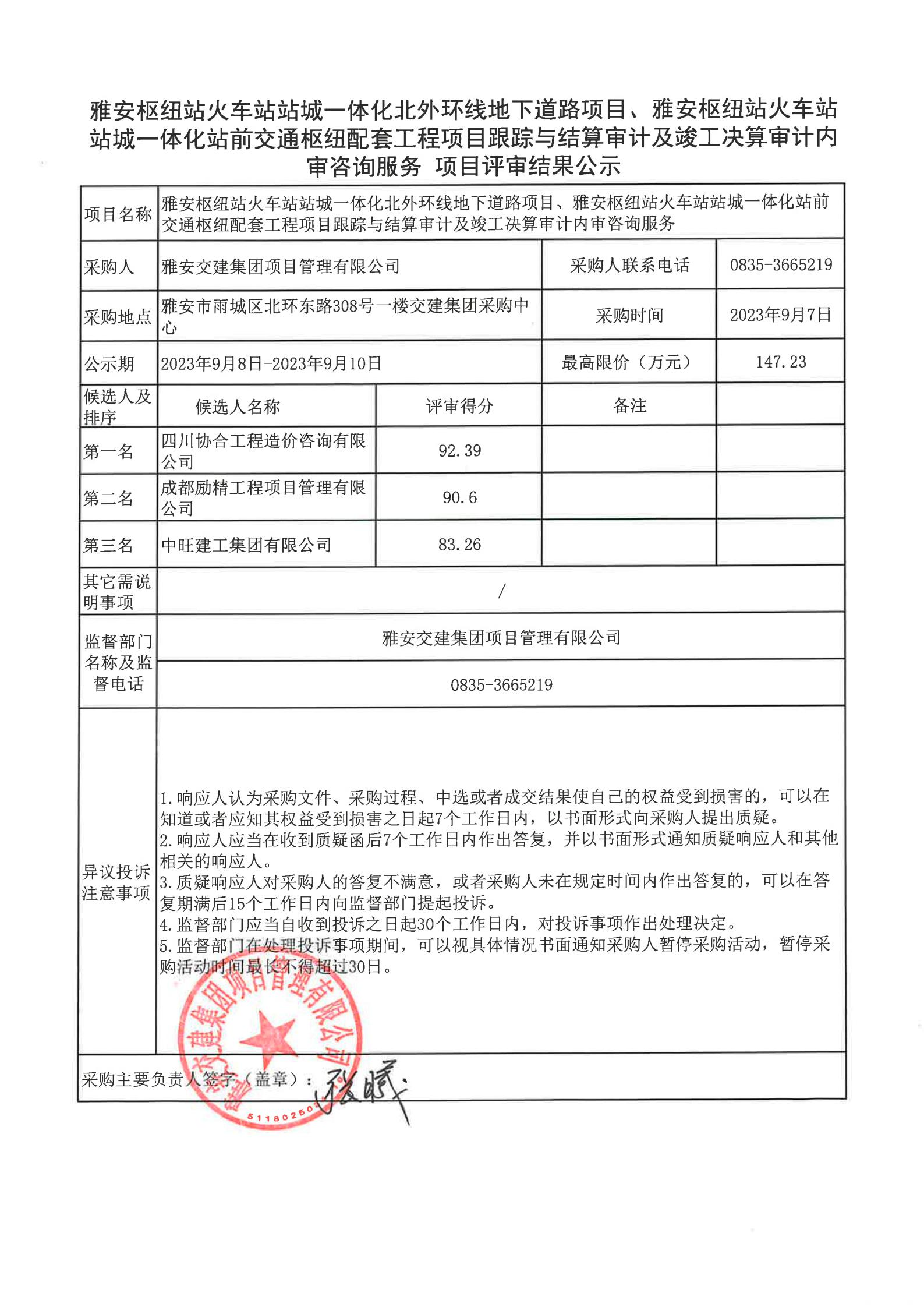 雅安交建集團項目管理有限公司雅安樞紐站火車站站城一體化北外環(huán)線地下道路項目、樞紐站火車站站成一體化站前交通樞紐配套工程項目跟蹤與結(jié)算審計及竣工決算審計內(nèi)審咨詢服務(wù)項目評審結(jié)果公示