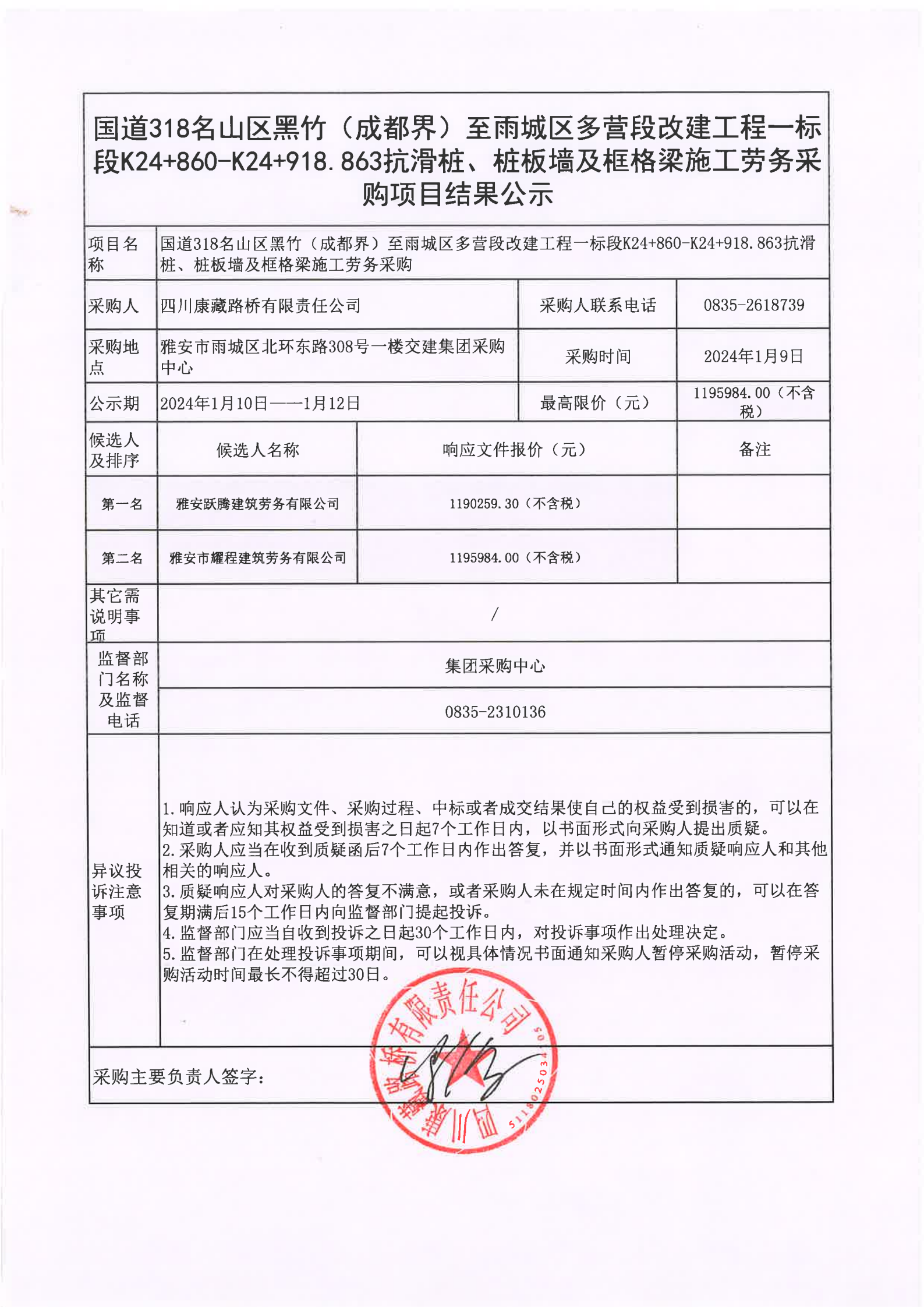 四川康藏路橋有限責(zé)任公司國道318名山區(qū)黑竹(成都界)至雨城區(qū)多營段改建工程一標段K24+860-K24+918.863抗滑樁、樁板墻及框格梁施工勞務(wù)采購項目結(jié)果公示