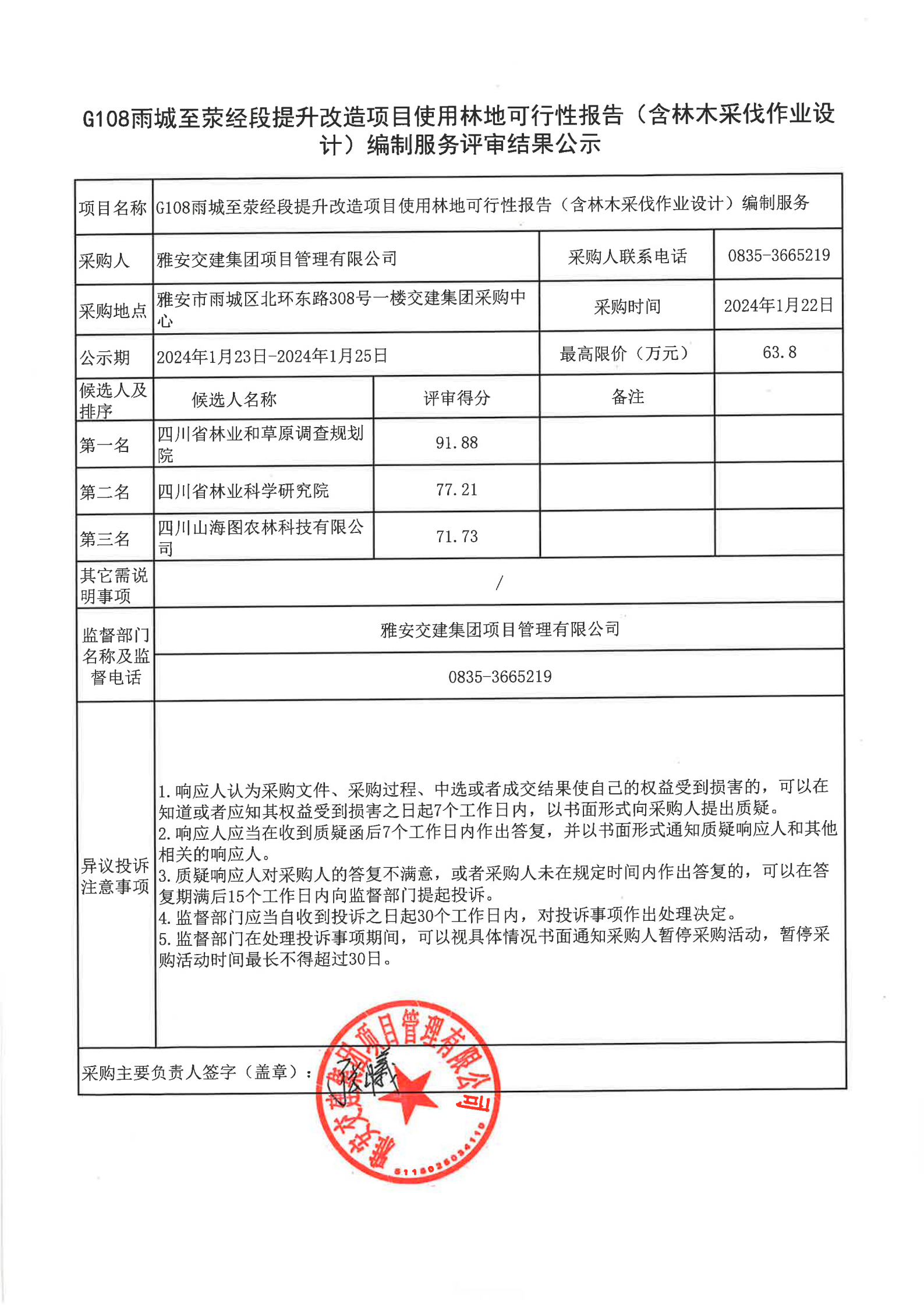 雅安交建集團(tuán)項目管理有限公司G108雨城至滎經(jīng)段提升改造項目使用林地可行性報告(含林木采伐作業(yè)設(shè)計)編制服務(wù)評審結(jié)果公示