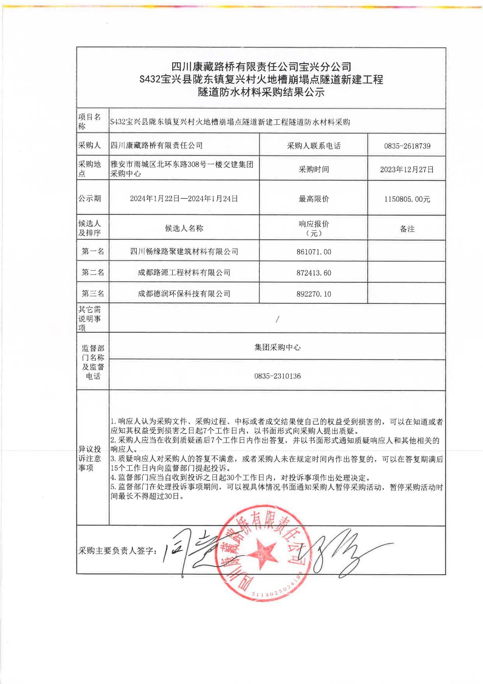 四川康藏路橋有限責任公司寶興分公司S432寶興縣隴東鎮(zhèn)復興村火地槽崩塌點隧道新建工程隧道防水材料采購結(jié)果公示