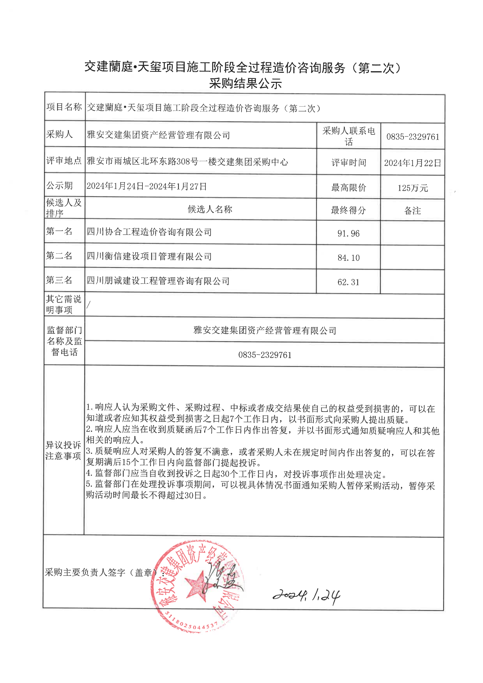 雅安交建集團(tuán)資產(chǎn)經(jīng)營(yíng)管理有限公司交建蘭庭·天璽項(xiàng)目施工階段全過程造價(jià)咨詢服務(wù)(第二次)采購(gòu)結(jié)果公示