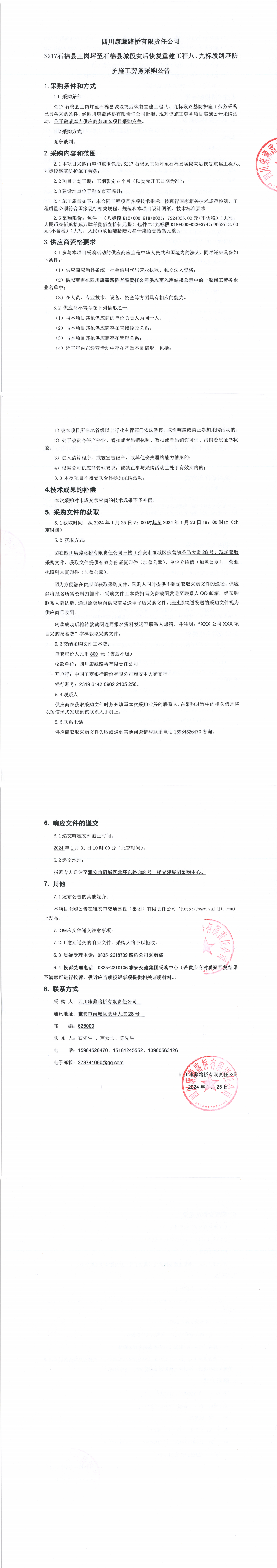四川康藏路橋有限責任公司S217石棉縣王崗坪至石棉縣城段災后恢復重建工程八、九標段路基防護施工勞務采購公告