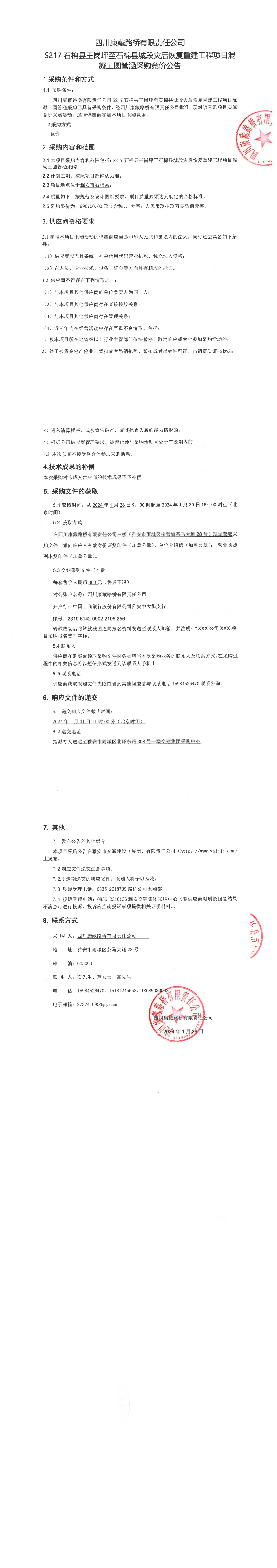 四川康藏路橋有限責任公司S217石棉縣王崗坪至石棉縣城段災(zāi)后恢復重建工程項目混凝土圓管涵采購競價公告